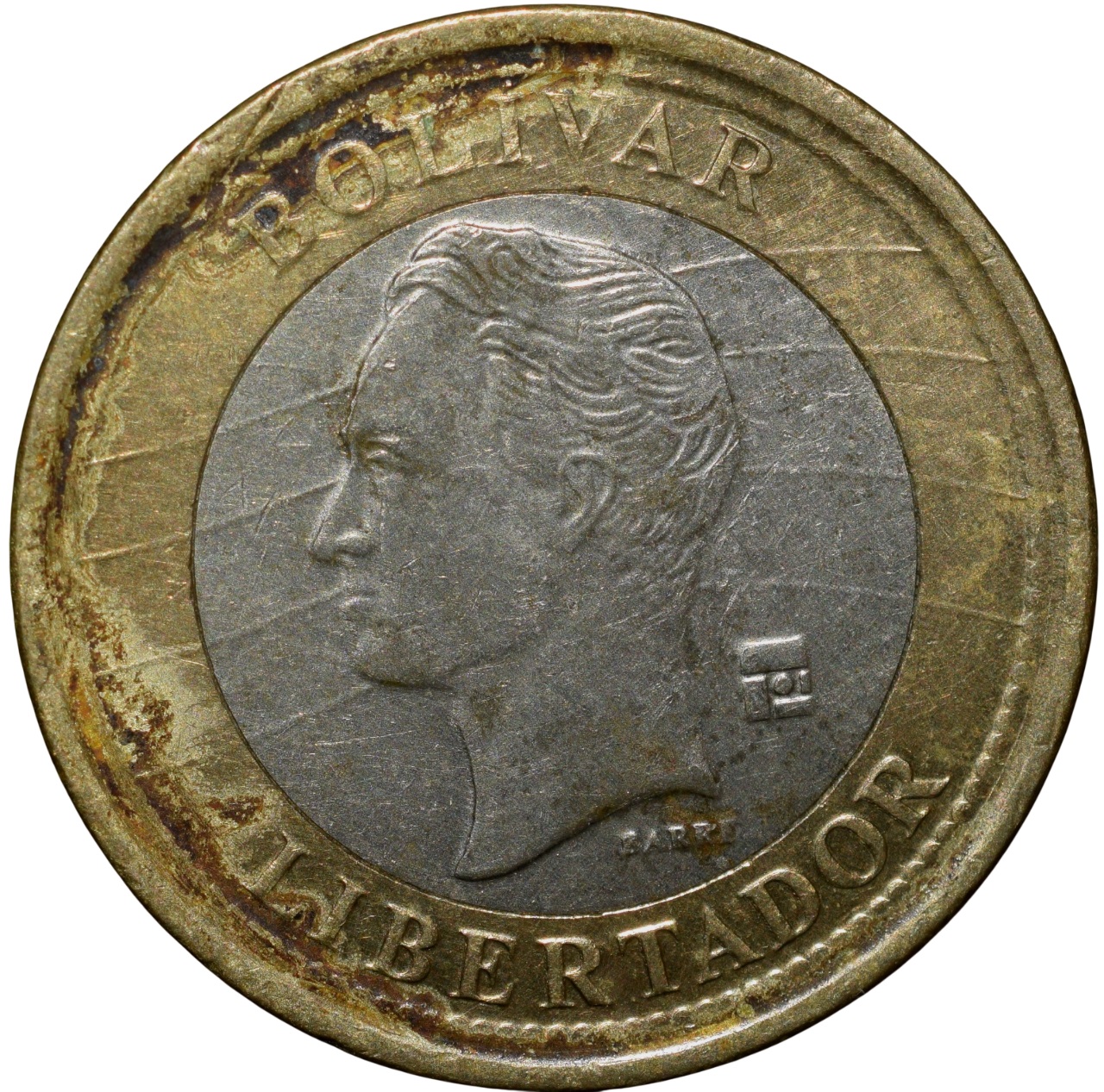 Venezuela Country, (AD 2009), Bi-Metallic 1 Boloiviar, Obv: Portrait facing left, Inscriptions, Rev: Shield & Denomination in Centre, Inscription & date around, 8.06 Gms, 21.98 mm, Very Fine.