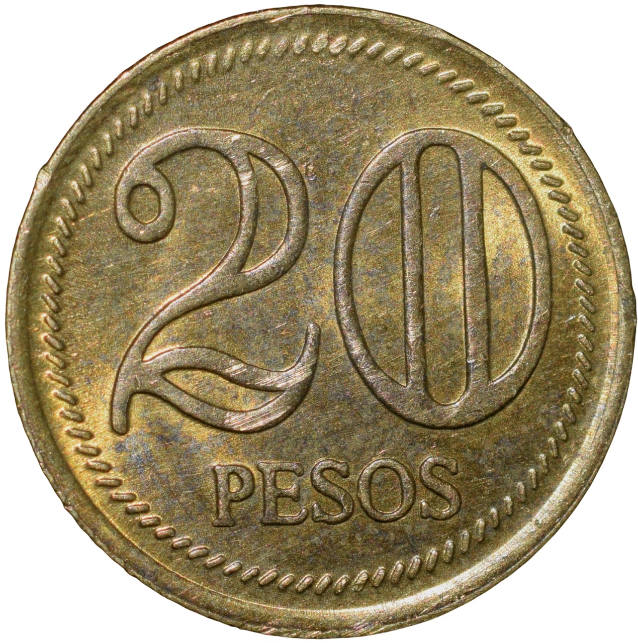 Colombia Country, (AD 2004), Brass 20 Pesos, Obv: Portrait of Simón Bolívar (1783-1830) facing left, Rev: Denomination, 2.00 Gms, 17.20 mm, Extremely Fine.
