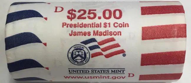 A James Madison Presidential Dollar coin roll would contain 25 uncirculated coins featuring the portrait of James Madison, the fourth President of the United States. These coins were part of the Presidential Dollar Coin Program, which ran from 2007 to 2016, and featured each president in the order they served. The James Madison dollar coin was released in 2007.