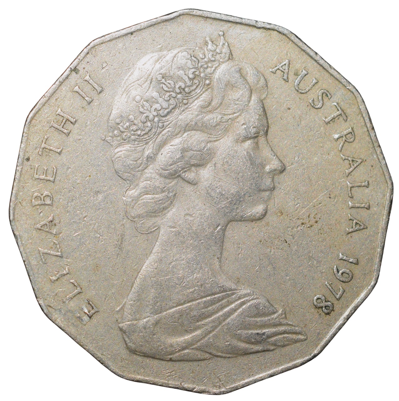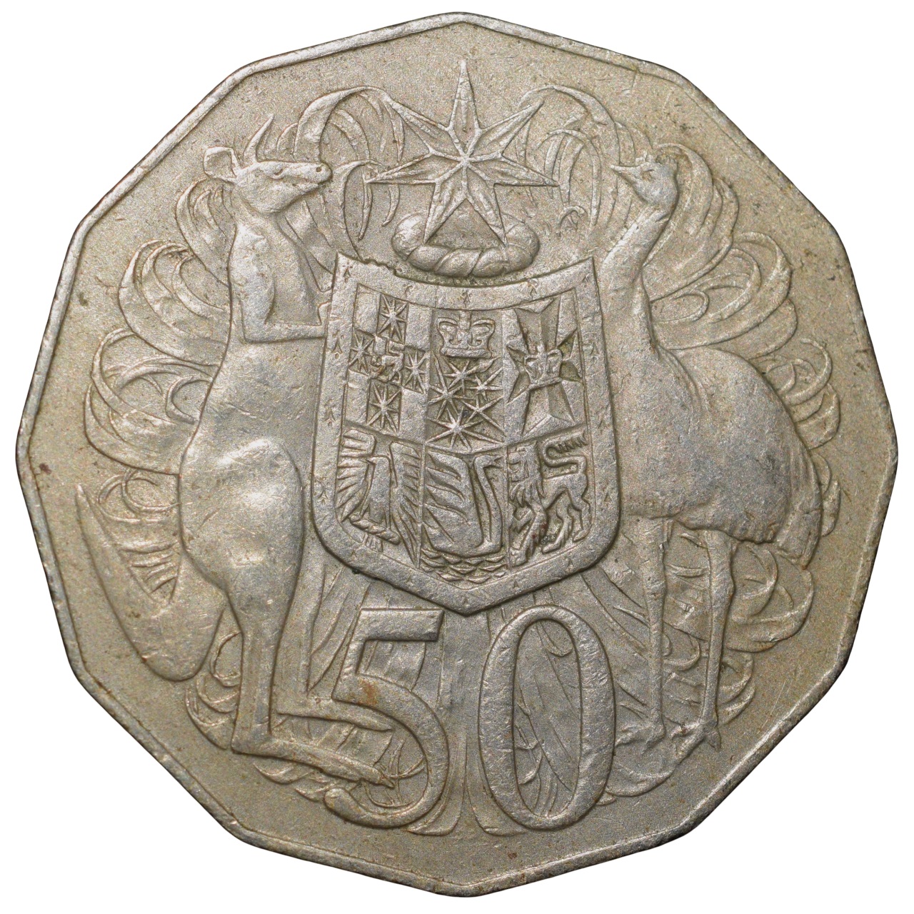 Copper-Nickel 50 Cents of Elizabeth II of Australia (AD 1978) with a red kangaroo (Macropus rufus) and an Emu (Dromaius novaehollandiae)