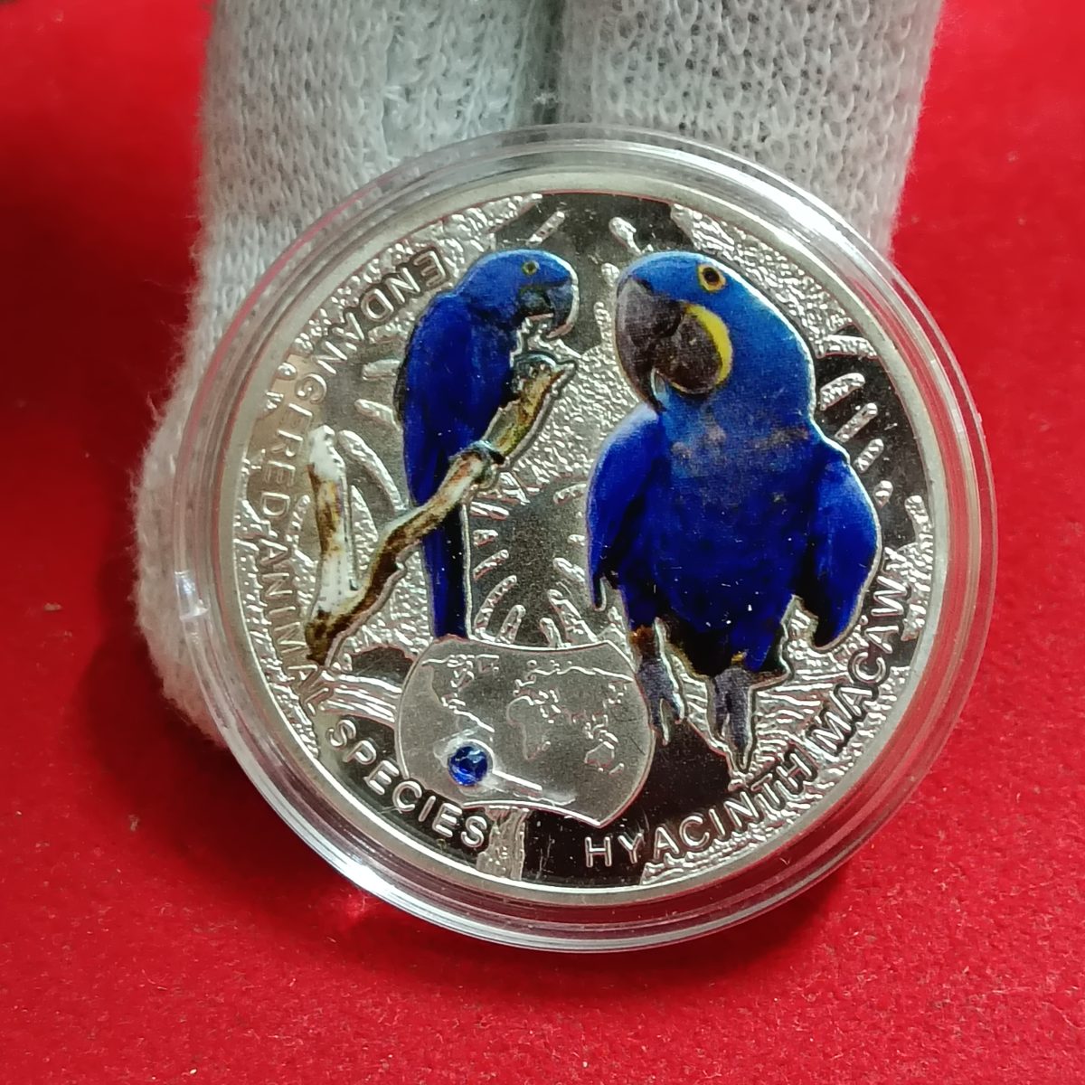 Introducing the Extremely Rare 1000 KWACH 2014 Endangered Animal Species – Hyacinth Macaw Republic of Zambia collectible coin. Issued in the year 2014 by the Republic of Zambia, this special proof coin features the stunning Hyacinth Macaw, showcasing intricate details and craftsmanship. Crafted with a blend of metals, including silver coating, this coin holds a significant place in numismatic history due to its limited availability and unique design. The Hyacinth Macaw, an endangered animal species, adds a touch of conservation awareness to this collectible piece.