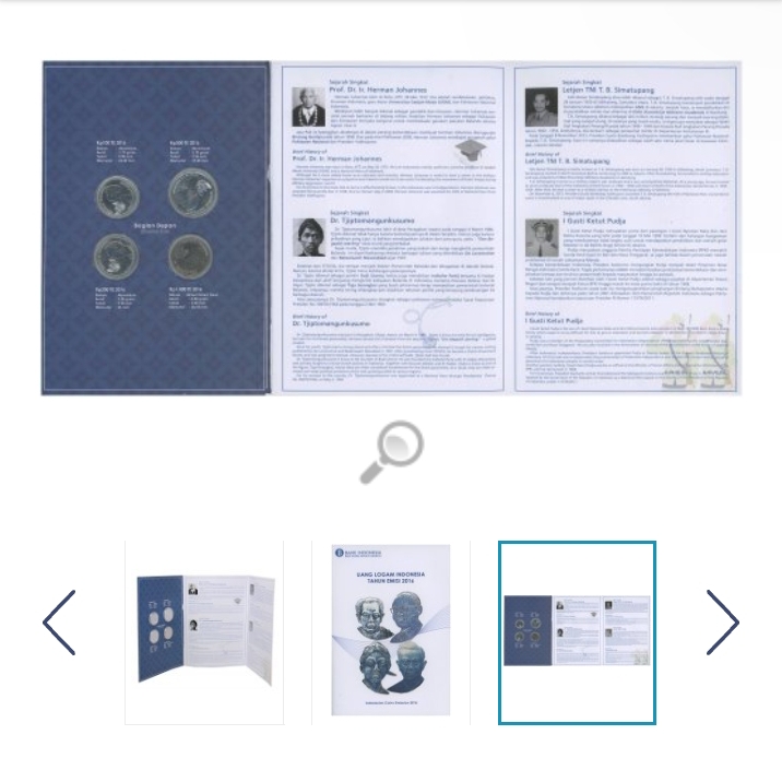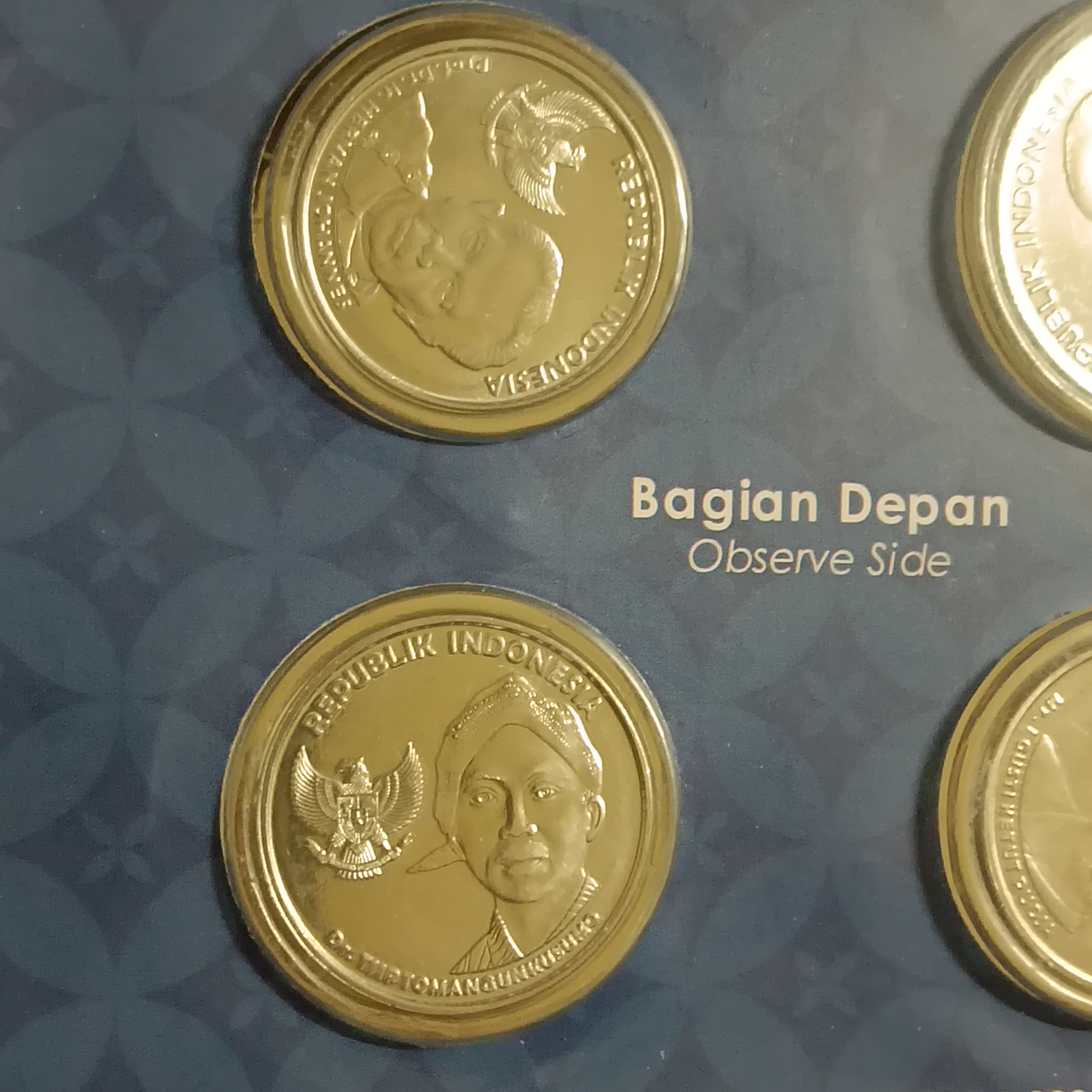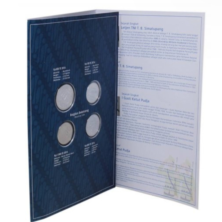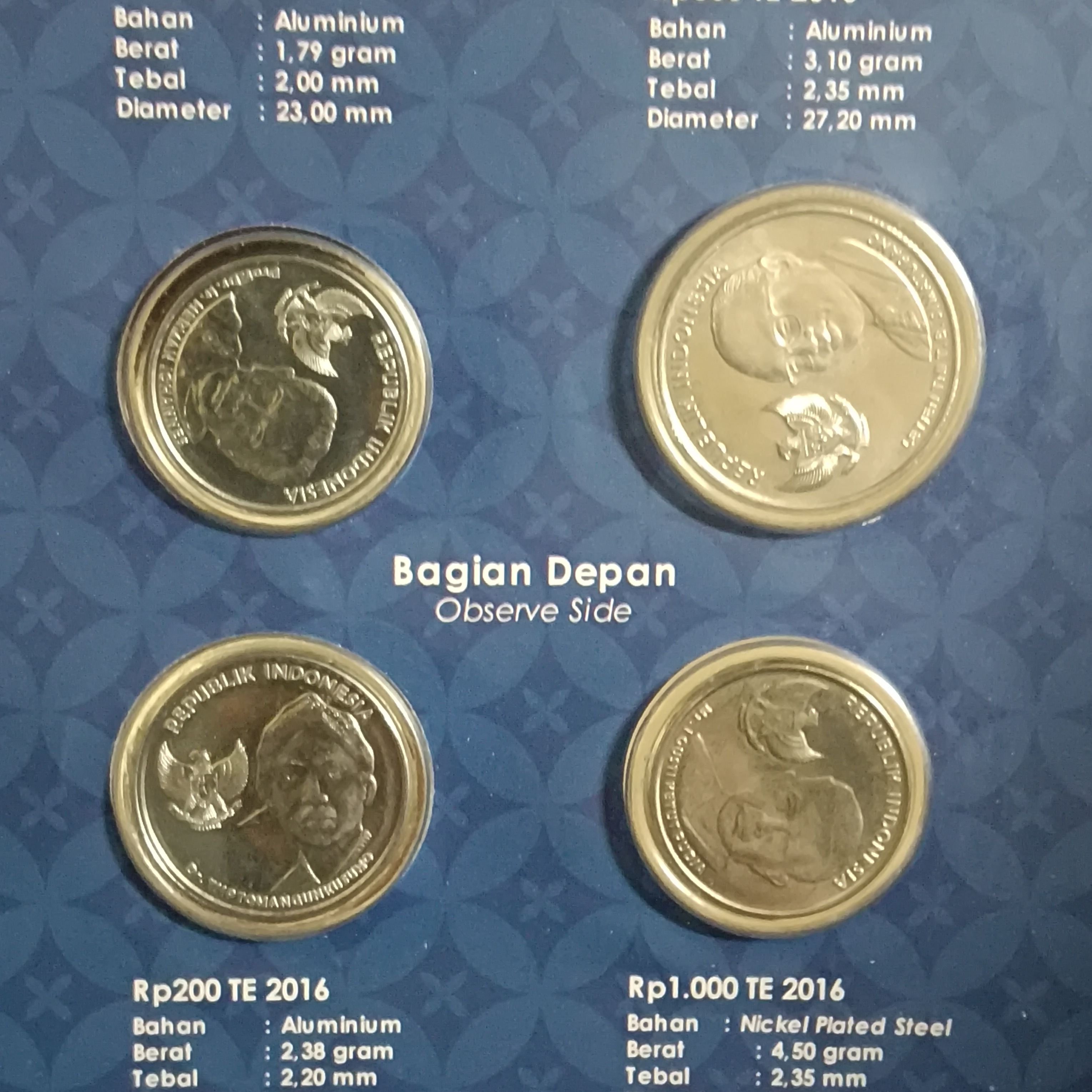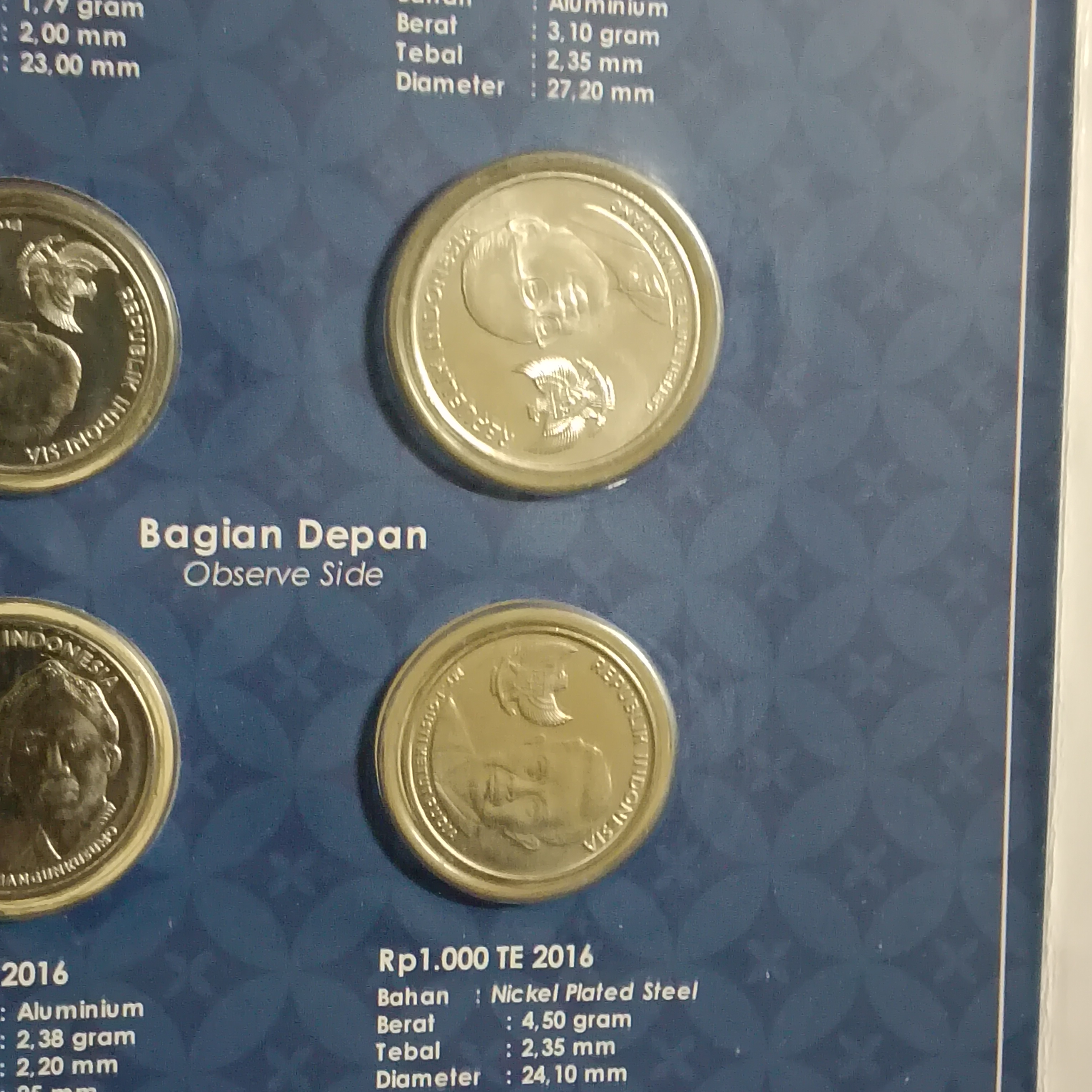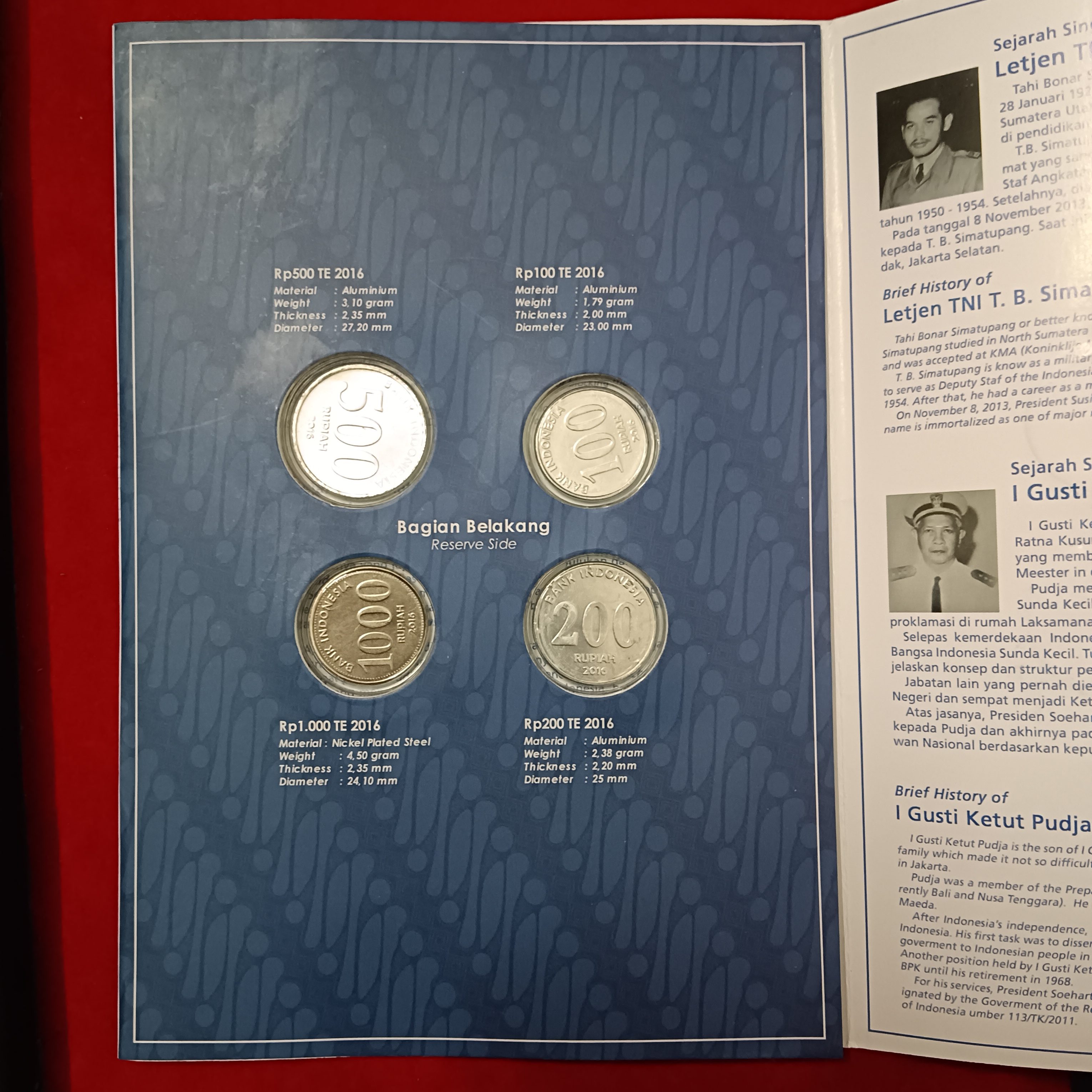 - Indonesia 100-1,000 Rupiah coin set contains four pieces coins from 2016 that have KM numbers ranging from KM #71 to KM #74, are in mint (M) condition, and feature the National heroes. Additionally, the coin set comes with a folder.