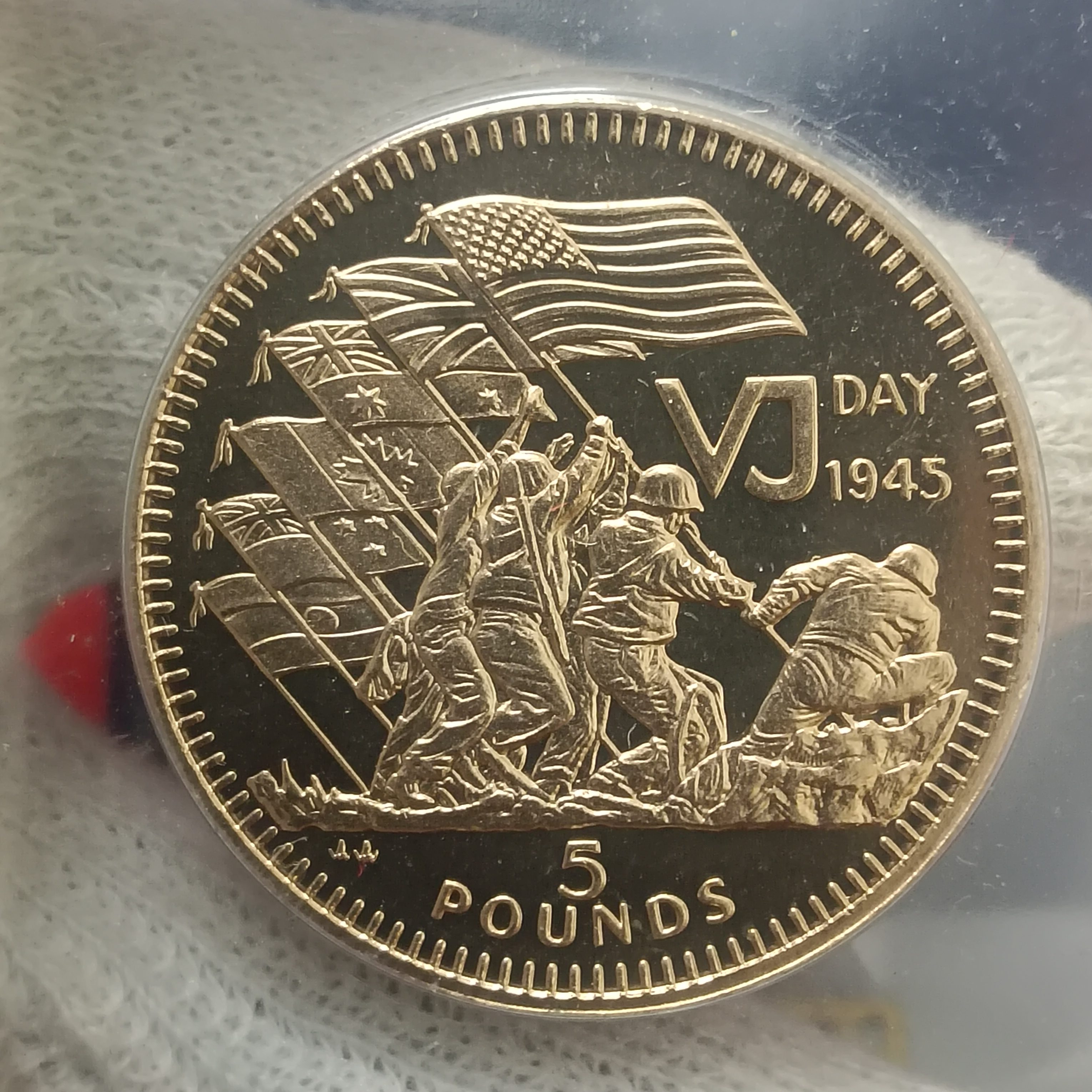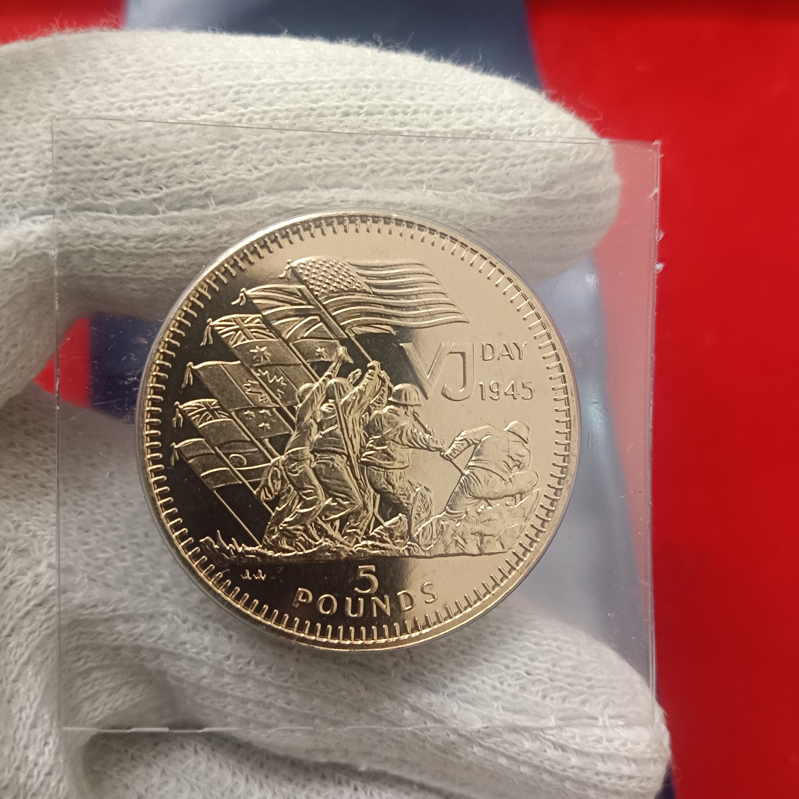 Gibraltar 5 Pounds coin commemorating VJ Day (Victory over Japan Day) in 1945.