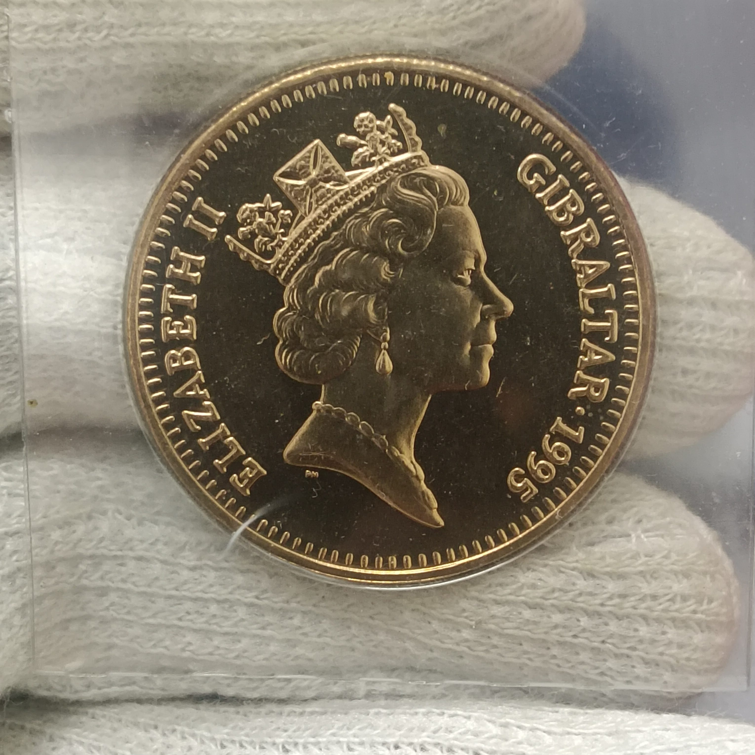 The obverse of the coin would typically feature the coat of arms of Gibraltar and details like metal weight, purity, and face value.