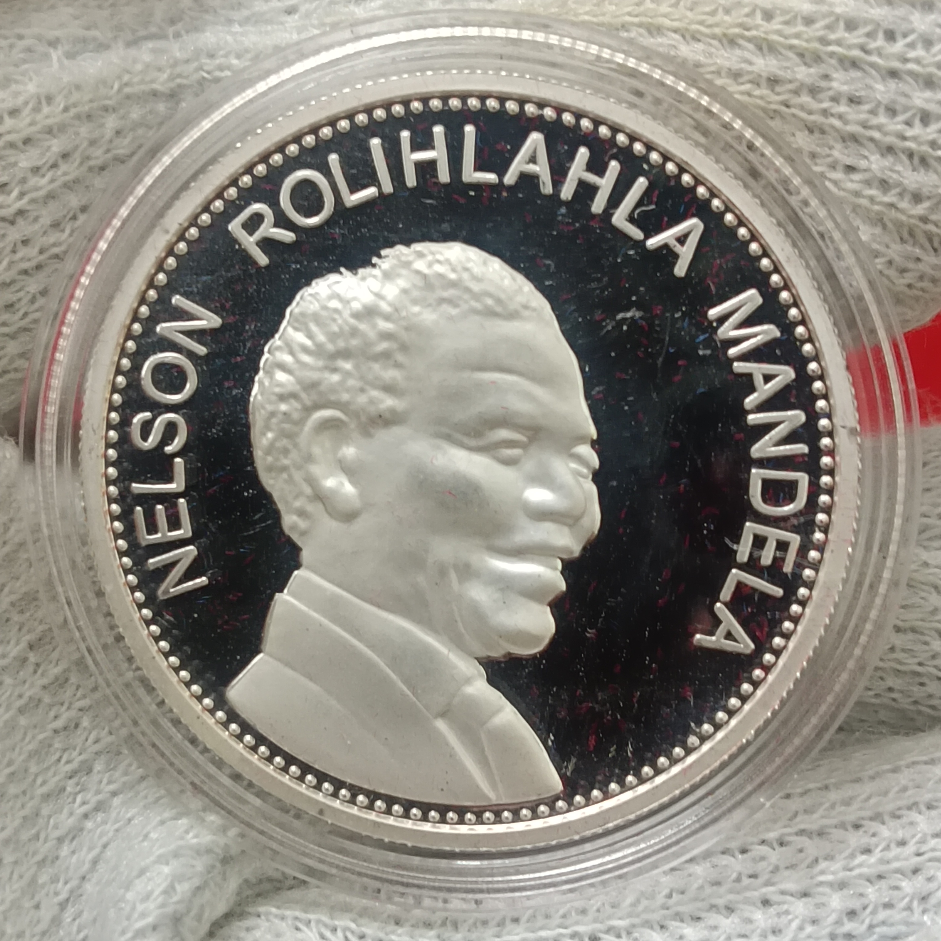 It’s a silver-plated commemorative coin that honors Nelson Mandela, the former president of South Africa and a key figure in the anti-apartheid movement.
