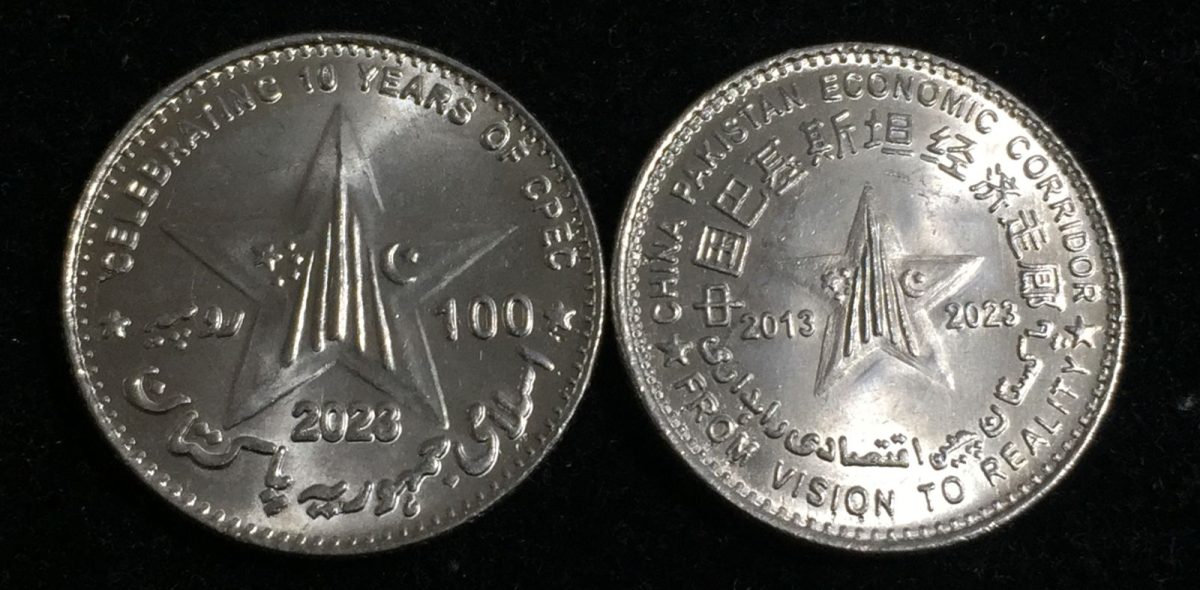The Pakistan 100 Rupees 2023 China-Pakistan Economic Corridor Commemorative issue GEM UNC Coin #D-193 is a circulating commemorative coin minted by the State Bank of Pakistan in 2023. Made of copper-nickel, this round coin weighs 13.50g and has a diameter of 30.00mm. It celebrates the 10 years of the China-Pakistan Economic Corridor, a significant milestone in economic cooperation between the two countries. The obverse features intricate designs symbolizing the partnership, while the reverse depicts the denomination and commemorative details. This coin holds a special place in numismatic collections due to its historical significance and limited mintage. Collectors and enthusiasts are drawn to its unique thematic representation and the opportunity to own a piece of this important economic alliance. The coin comes in uncirculated (UNC) condition, making it a pristine addition to any collection.
