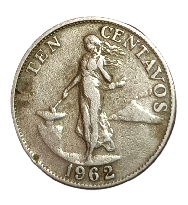 PHILIPPINES German Silver 10 CENTAVOS Year 1962 Anvils, Cost of Arms, Hammers, Women **SCARE** High Collectable Grade.