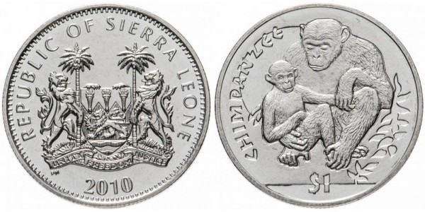 Sierra Leone, 1 Dollar, 2010, Monkey Series – Chimpanzee, KM #366, UNC Condition.