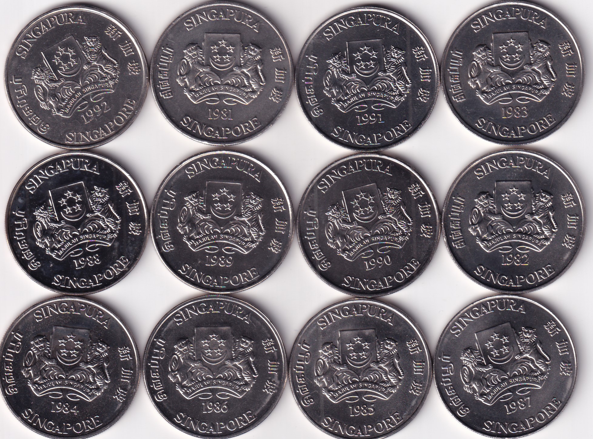 SINGAPORE 12 DIFFERENT ZODIAC COMMEMORATIVE UNC 10 DOLLAR COINS SET WITH BOX AND STAND