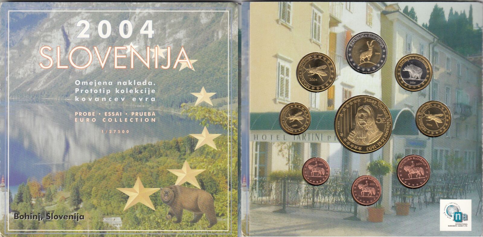 Slovenia 2004 1 Cent – €5 Euro UNC 9 Pattern Probe Essai Coin Set – Info BEAUTIFULFOLDER PACKAGING