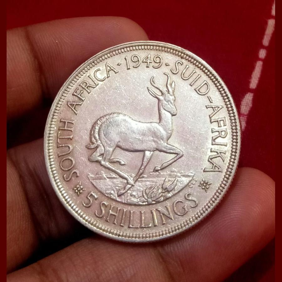 SOUTH AFRICA Silver FIVE SHILLINGS 5S King GEORGE-VI Weight 29 Grams “CROWN SIZE” Diameter 39 mm Year 1949 RARE High Collectable Grade.