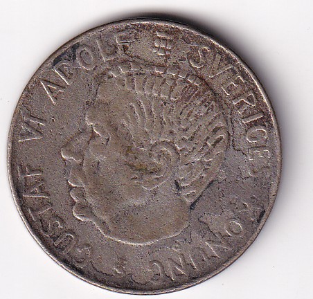 Head of King Gustaf VI Adolf facing left. Surrounded by inscription. Below the neck the initials of the Governor of the RiksBank.