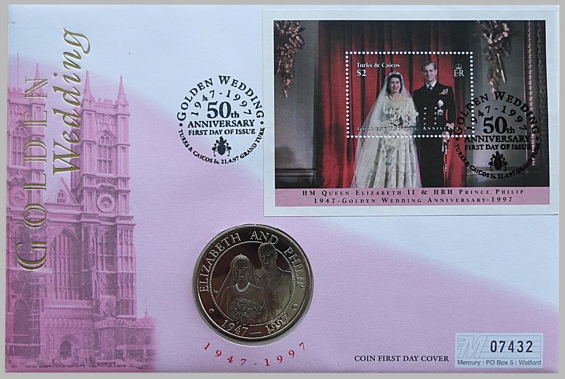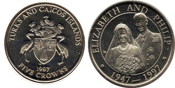 Turks and Caicos Islands, 5 Crowns, 1997, 50th Anniversary of the Marriage of Queen Elizabeth II and Prince Philip, KM #262, Coin First Day Cover.