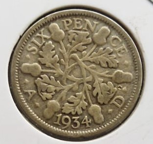 United Kingdom, 1934, 6 Pence, George V, KM #832, Silver, Condition as per image.