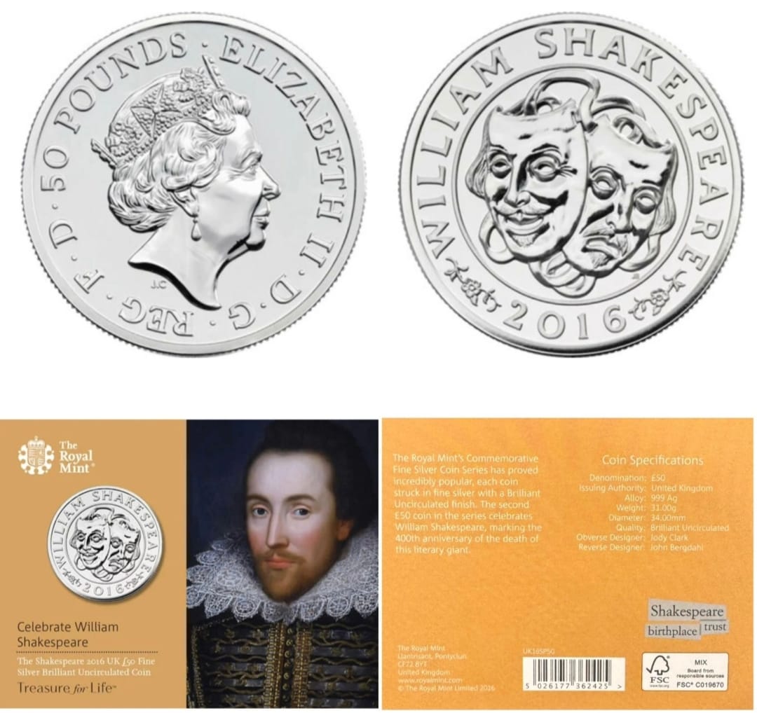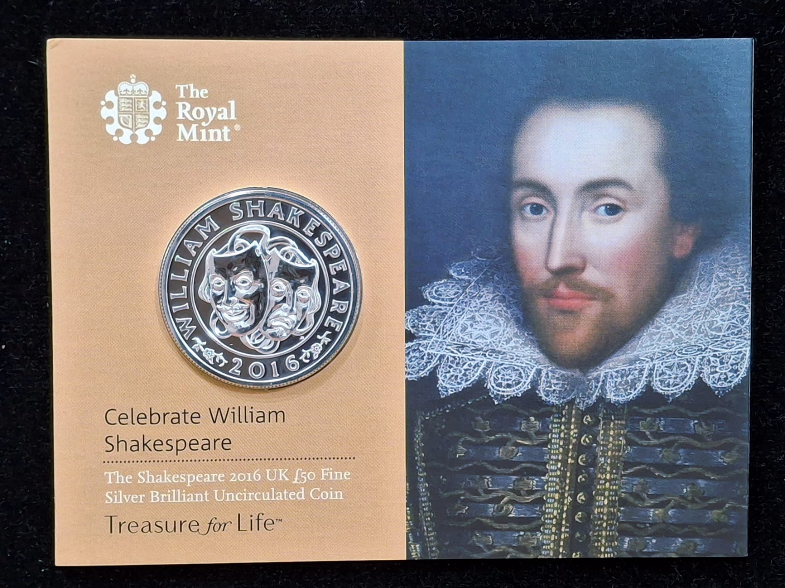 United Kingdom 50 Pounds 2016 – Elizabeth II William Shakespeare Commemorative issue Royal Mint Issue Rare Silver (Weight 31 g)
