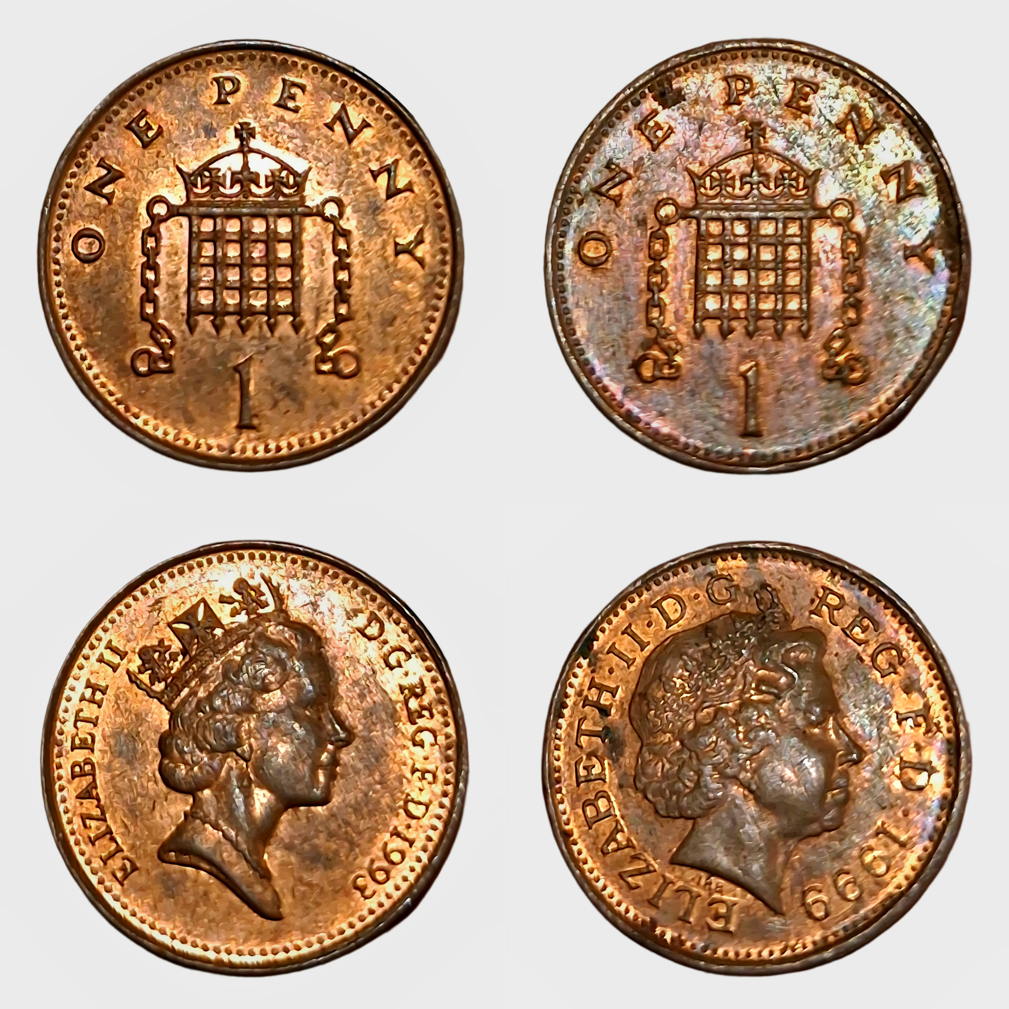United Kingdom GREAT BRITAIN Bronze ONE PENNY Year 1993 and Year 1999 Queen ELIZABETH-II “Young & Mature” Portraits SET 2 Coins **SCARE** High AUNC Grades.