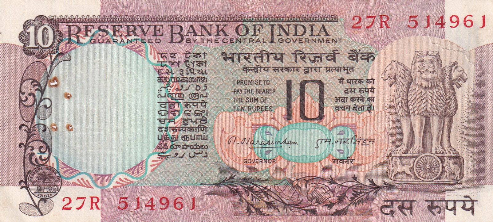 10 RUPEES GOVERNOR N. NARASINHAM TOP CONDITION RARE NOTE