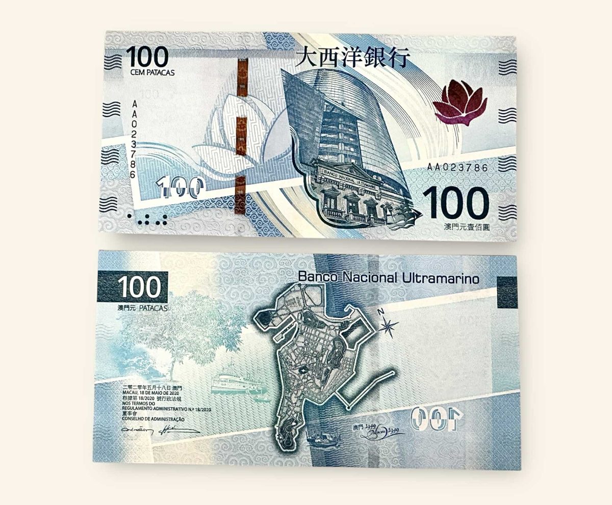 - 100 Patacas, indicated as “100 CEM PATACAS” and “100 澳門元 PATACAS” on the front, and “100” on the back.