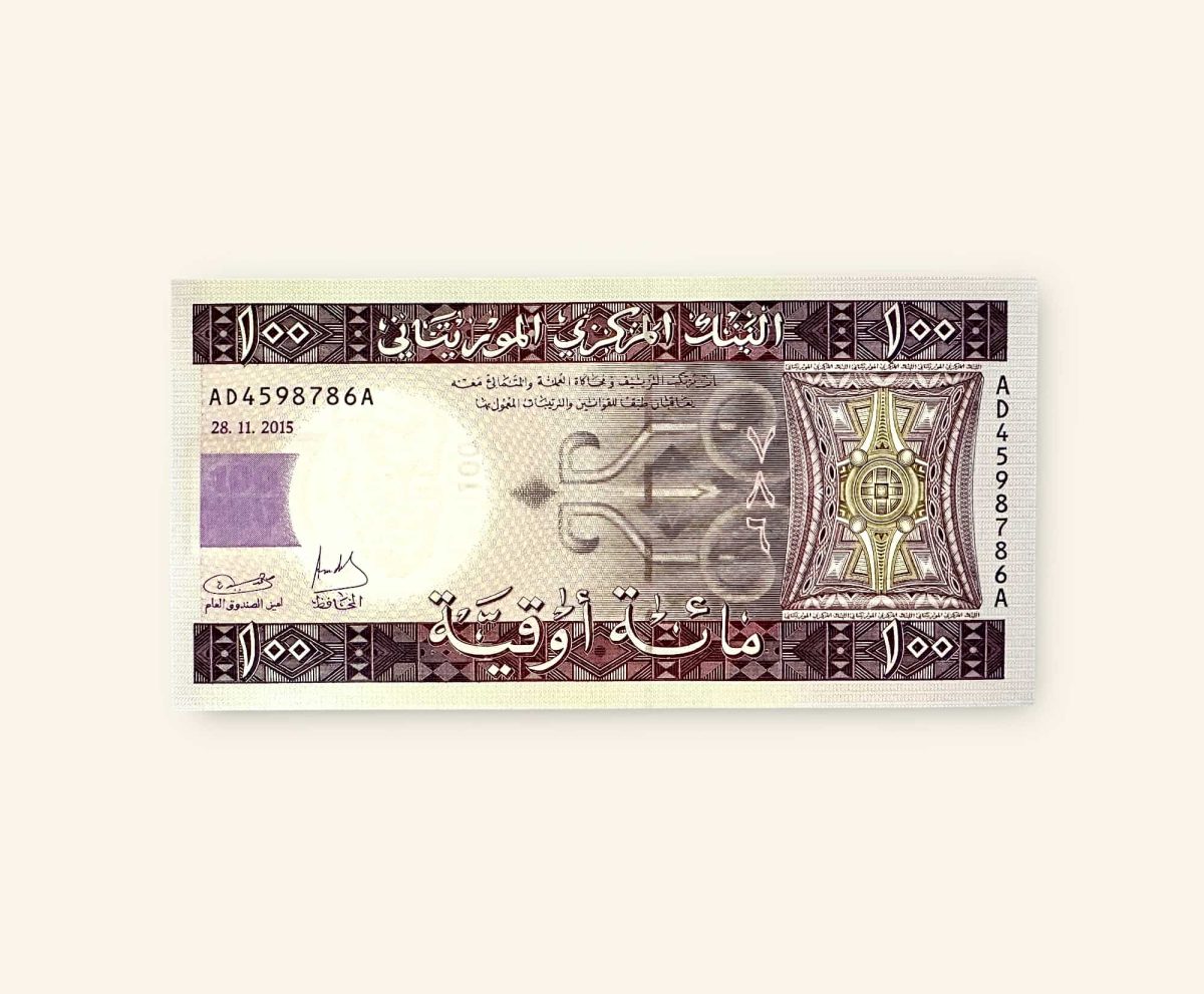 - Main Text: “BANQUE CENTRALE DE MAURITANIE” (Central Bank of Mauritania), “X100 CENT OUGUIYA”