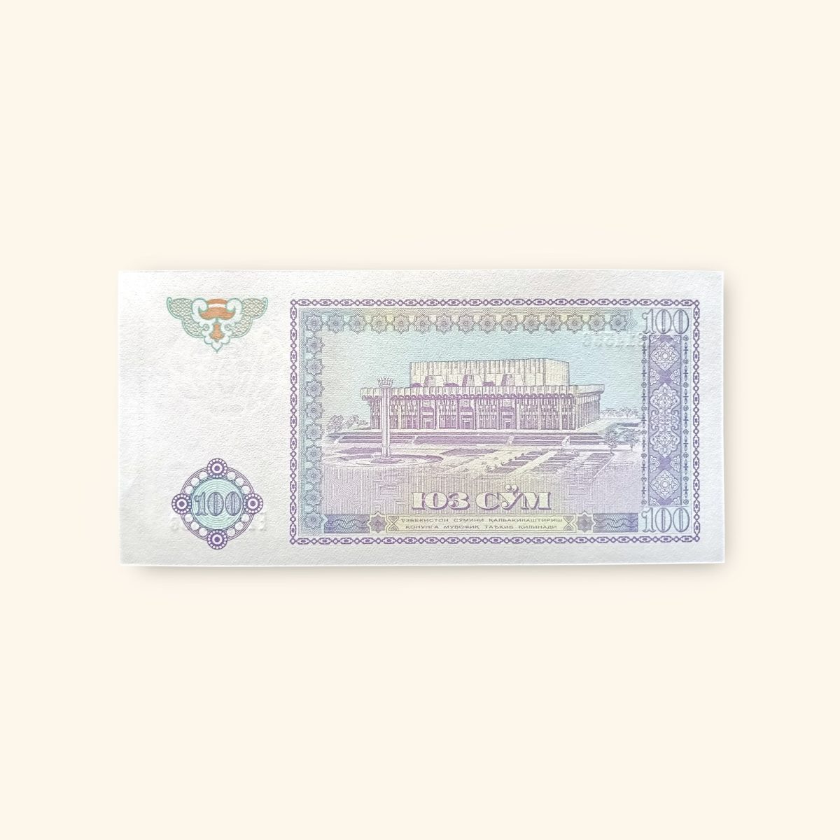 - Front Side: Features the Emblem of Uzbekistan and stylized peacocks. The text reads “УЗБЕКИСТОН РЕСПУБЛИКАСИ МАРКАЗИЙ БАНКИ” (Central Bank of the Republic of Uzbekistan) and “ЮЗ СУМ” (One Hundred Sum).