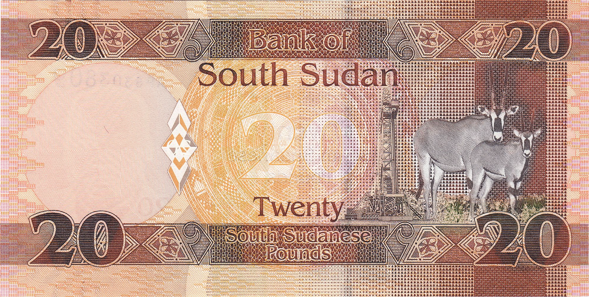 20 Sudanese Pounds of South Sudan (AD 2015-2017) with Picture of two Oryx antelopes, and an Oil derrick