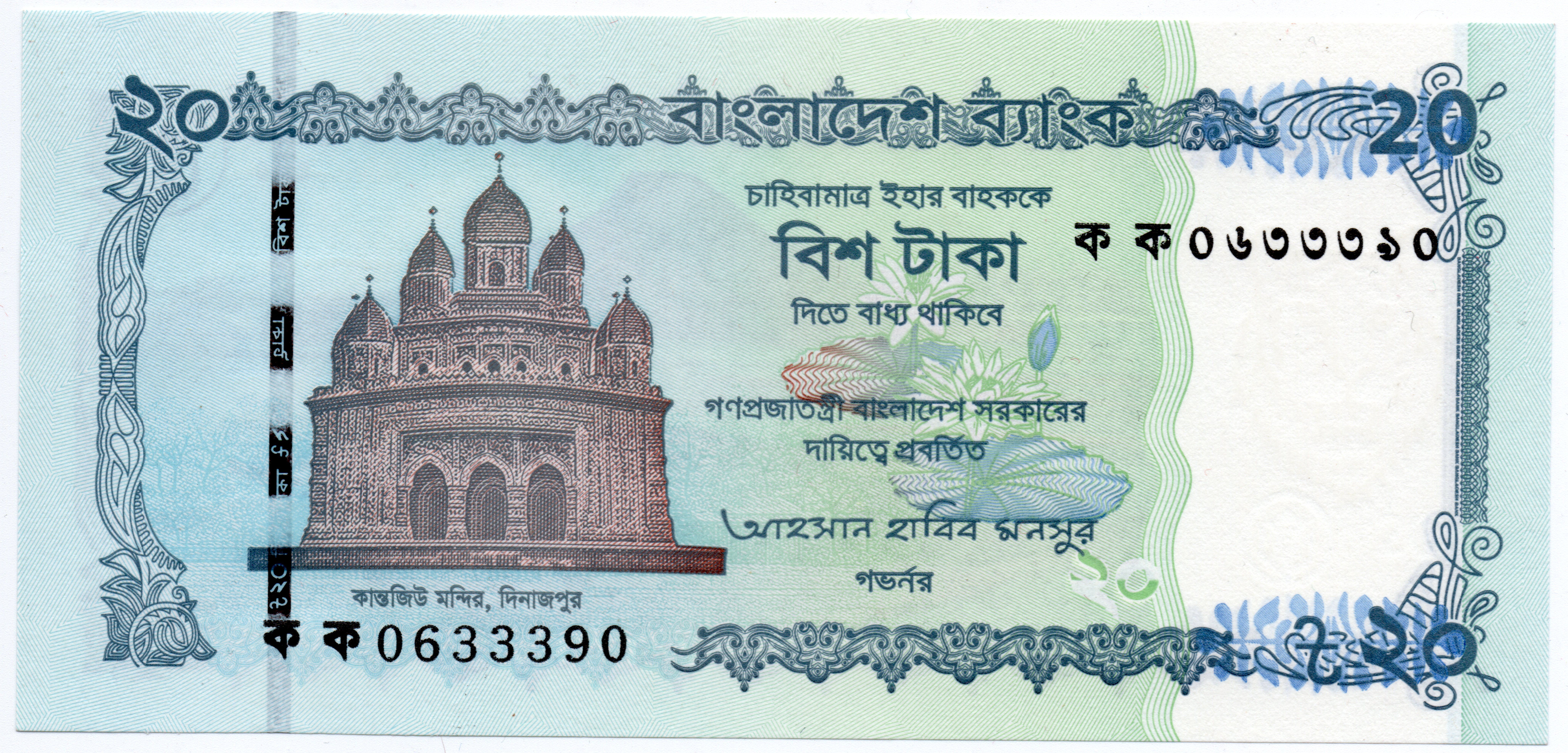 20 Taka of Bangladesh (AD2015) with Kantjiu Temple, Dinajpur/Paharpur Buddhist Monastery, Naogaon
