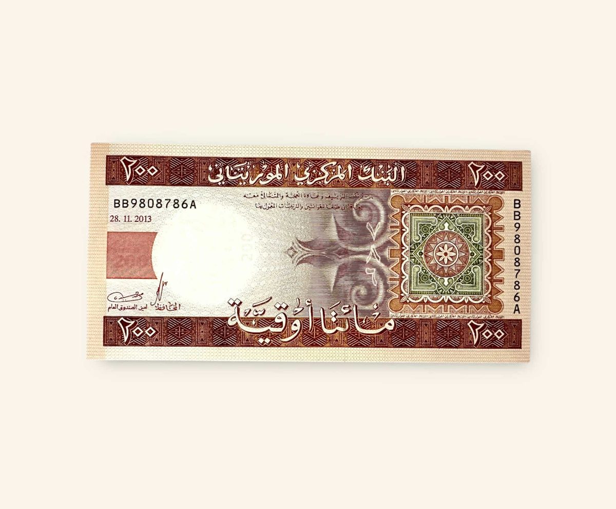 Ouguiya (MRU), with “DEUX CENTS OUGUIYA” (Two Hundred Ouguiya) written on it. The symbol for Ouguiya is UM.Value:200, displayed in numerals in multiple locations on the note.