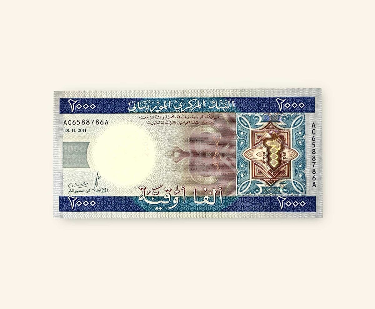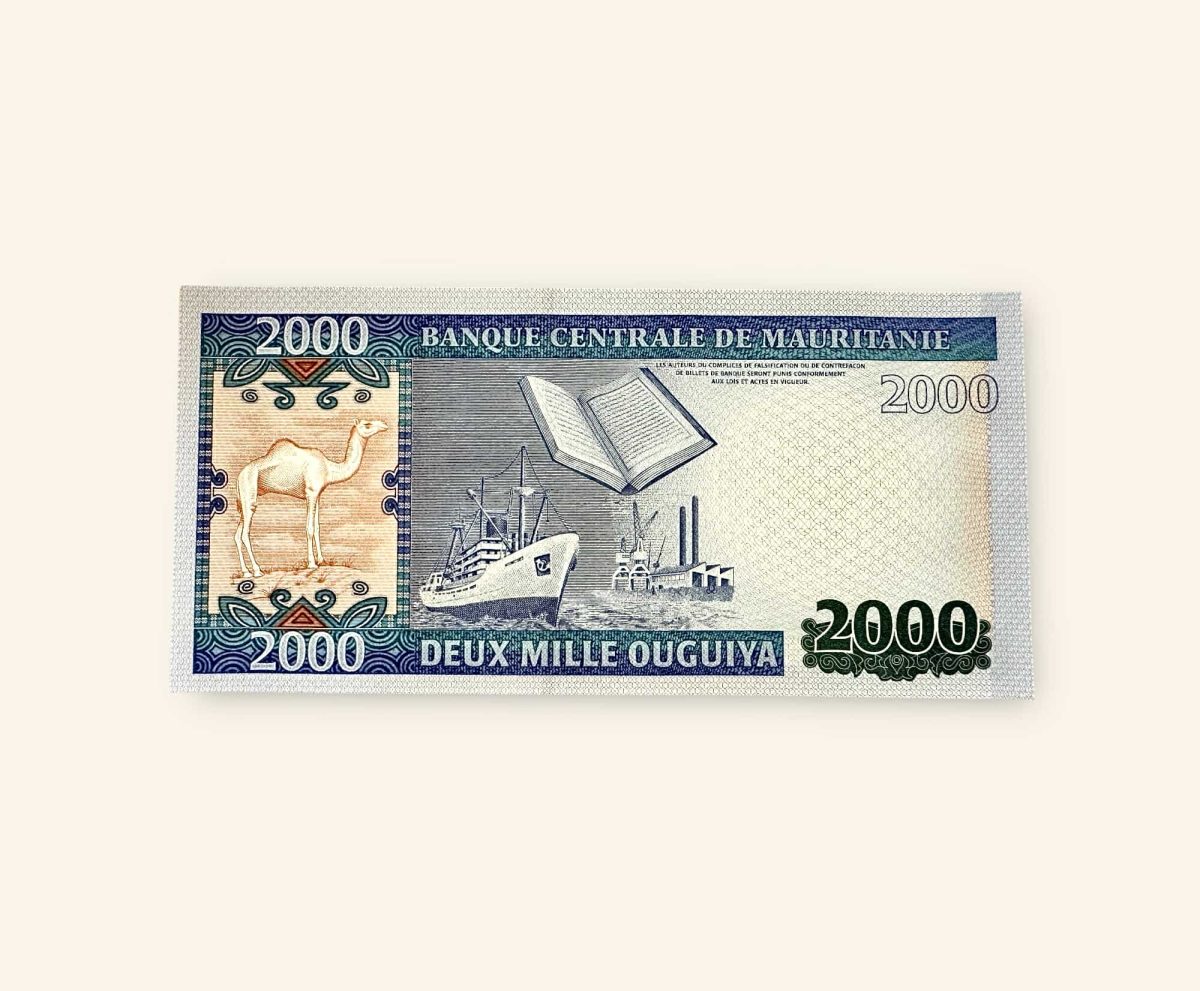 - Main Text: “BANQUE CENTRALE DE MAURITANIE” (Central Bank of Mauritania), “DEUX MILLE OUGUIYA” (Two Thousand Ouguiya)