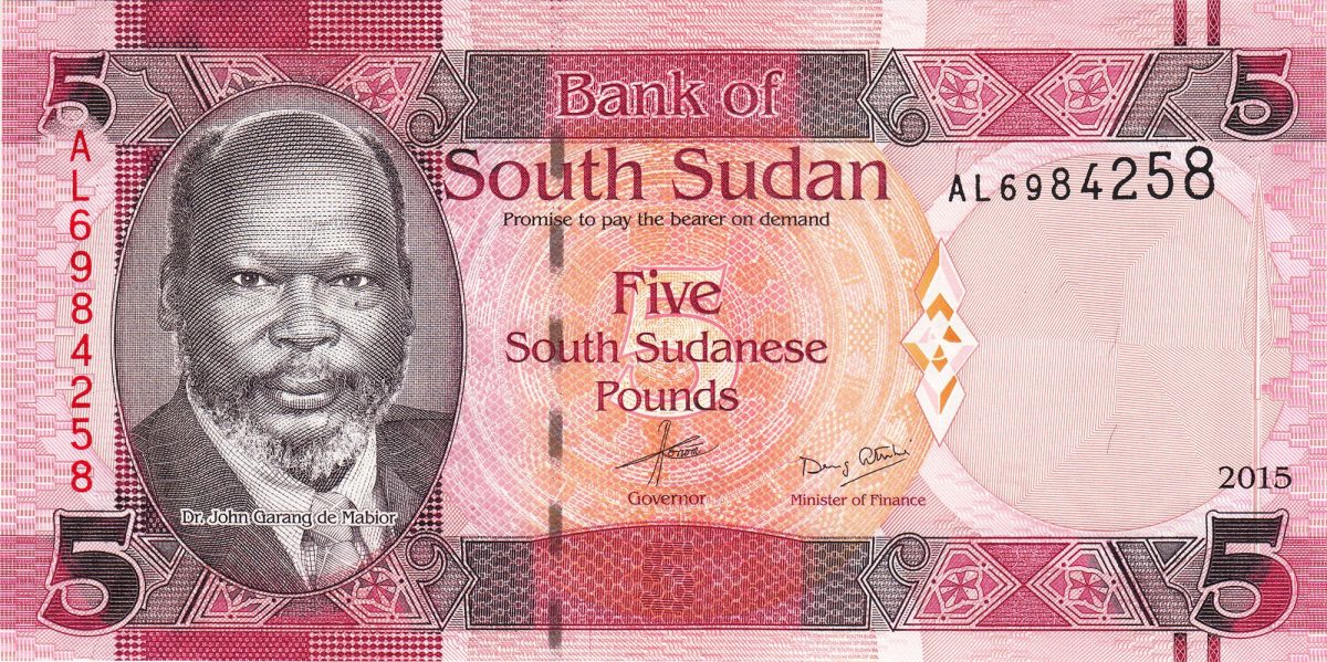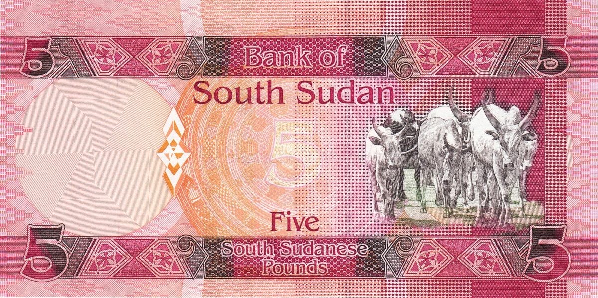 5 Sudanese Pound of South Sudan (AD 2015) with Sanga Juba cattle of the Dinka people