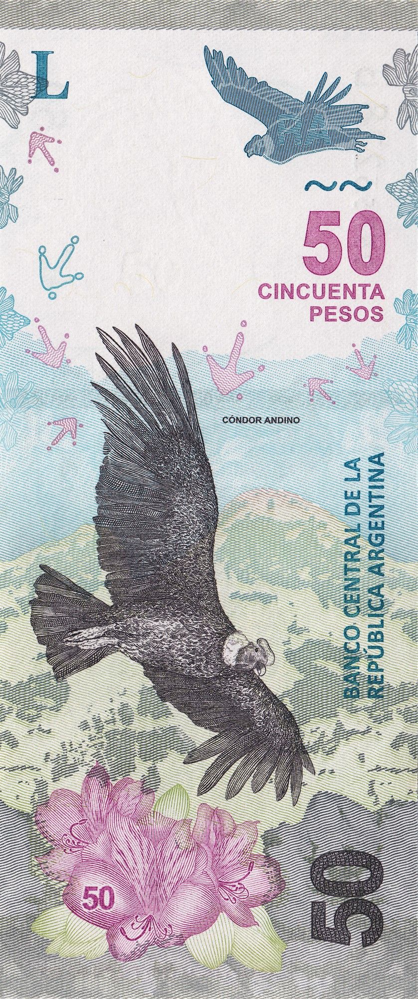 50 Pesos of Argentina (AD 2018-2020) with Andean Condor (Bird) in UNC Grade