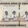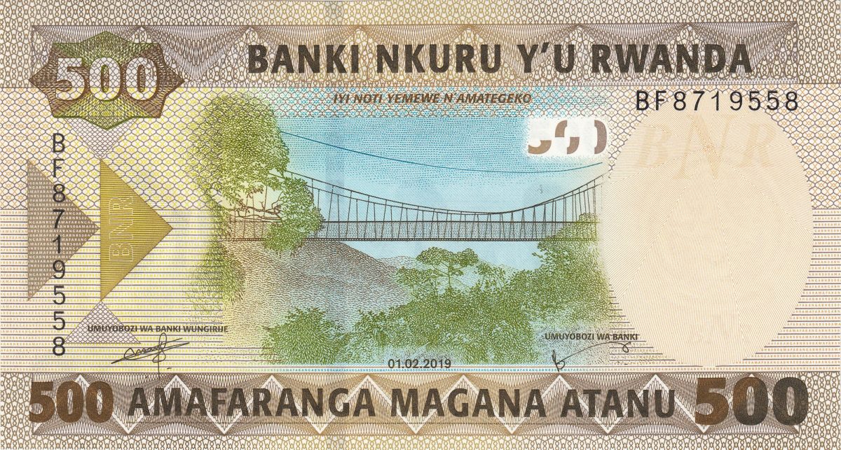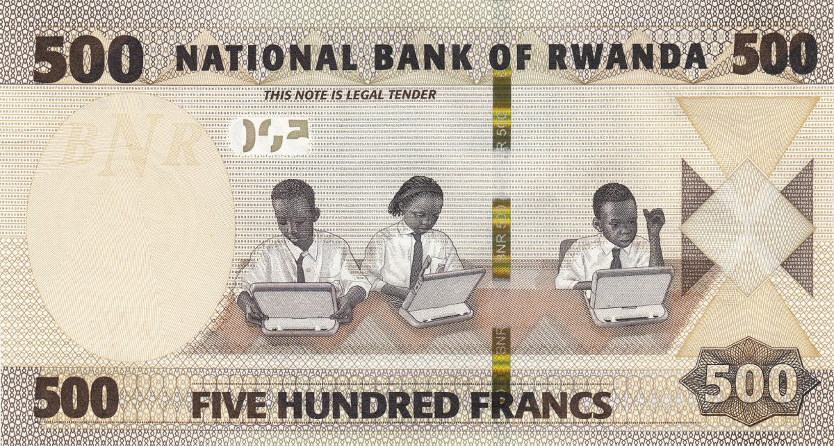 500 Francs of Rwanda Country (AD 2019) with Muregeya suspension footbridge/Three students working on OLPC XO laptop computers