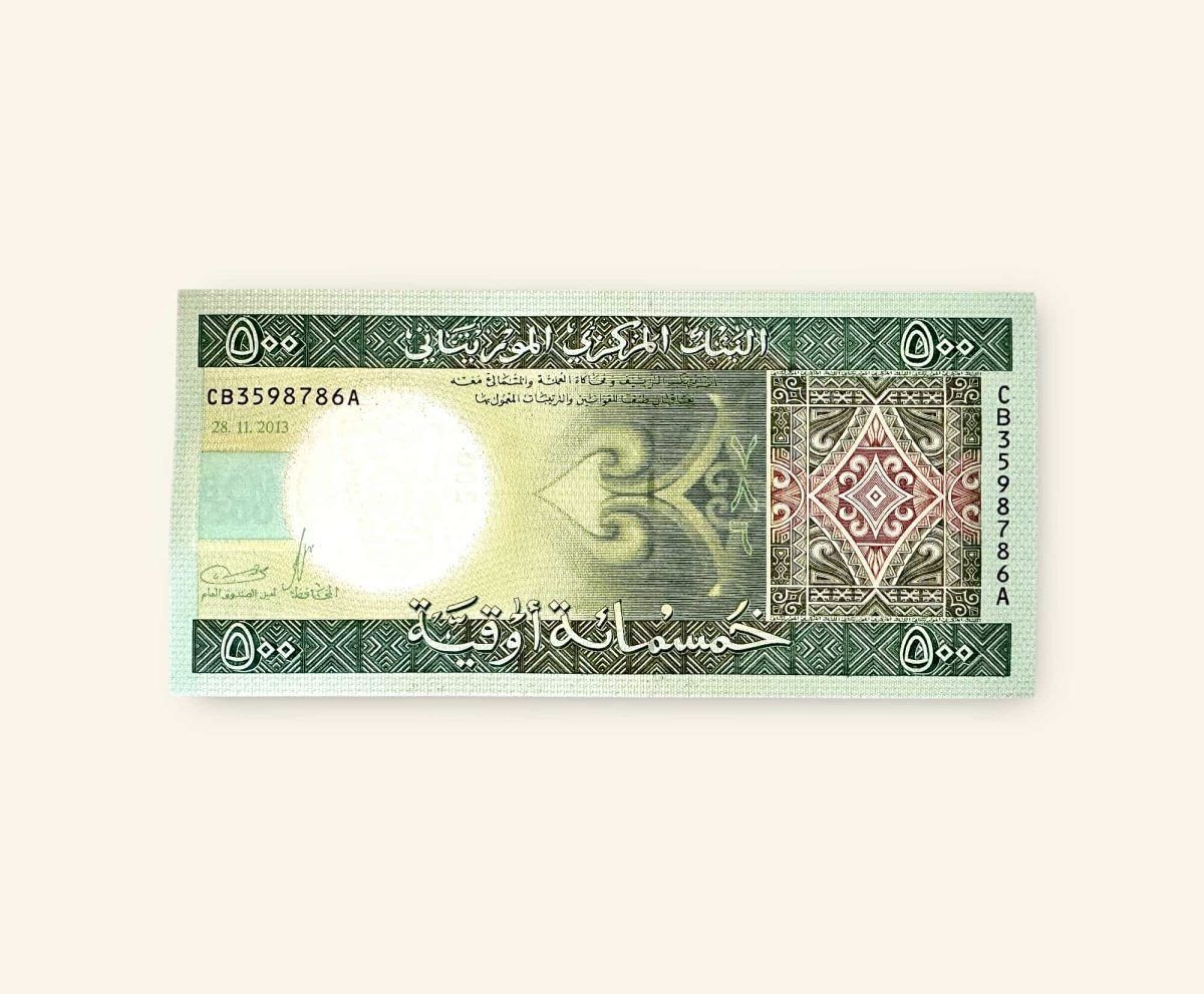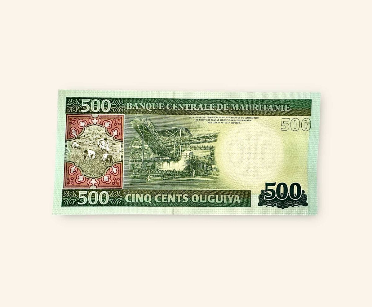The banknote is marked with “500” in multiple locations and states “CINQ CENTS OUGUIYA” (Five Hundred Ouguiya).Country:It is issued by the “BANQUE CENTRALE DE MAURITANIE” (Central Bank of Mauritania).Design:The banknote features imagery related to Mauritania’s economy, possibly depicting agricultural activities on the left and industrial operations in the center.Currency Information:The Mauritanian Ouguiya (MRU) has been the official currency of Mauritania since 1973, replacing the CFA franc. A currency reform in 2018 redenominated the Ouguiya, with 1 new Ouguiya equaling 10 old Ouguiya. The ISO 4217 code for the Ouguiya is MRU.