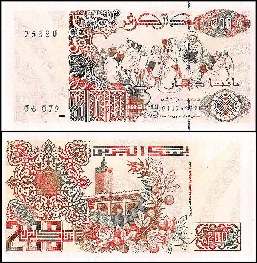 This uncirculated 200 Algerian dinar banknote is a standard circulation banknote issued by the Bank of Algeria. It is a brown banknote that is dated 21 May 1992, bears the signatures of Mustapha Guerdoud and Mohamed Laksaci, and measures 140 mm x 71.7 mm. Its obverse side shows ten students and one teacher studying the Koran. Its reverse side depicts seven concentric circles symbolizing the superimposed levels of heaven, figs and olives, and the Djemaa el-Djedid (New Mosque). Security features include a windowed security thread with demetalized Arabic text and a Barbary horsehead pattern watermark.