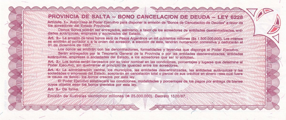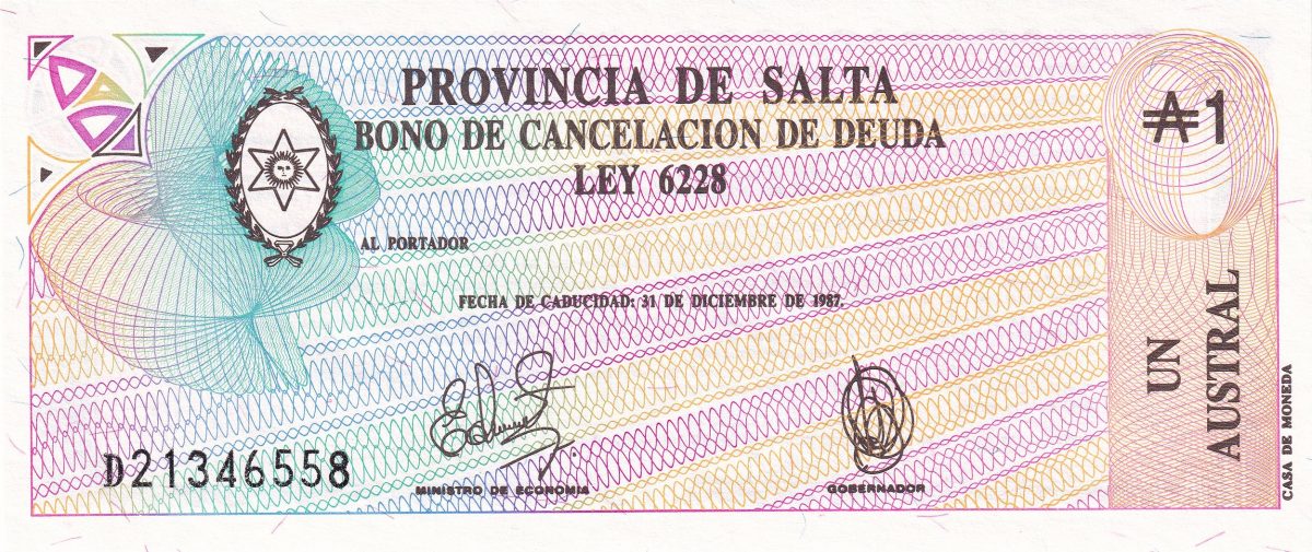 Argentina 1 Austral Salta World Banknote Bond UNC Unique and Rare
