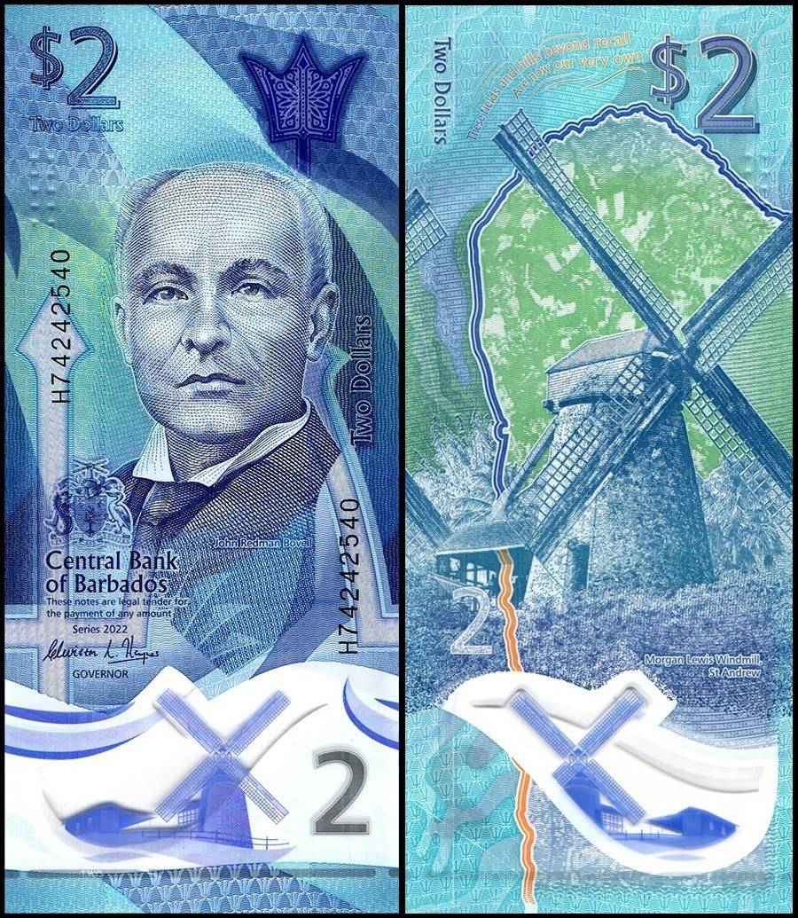 This uncirculated 2 Barbadian dollar note is a standard circulation banknote issued by the Central Bank of Barbados. It is a blue polymer banknote that is dated 2022, bears the signature of Bank Governor Mr. Cleviston L. Haynes, and measures 150 mm x 65 mm. Both sides of the banknote are vertically oriented and are in English. Its obverse side features John Redman Bovell and the national emblem. Its reverse side depicts a view of the Morgan Lewis windmill and the Barbados map. Because the banknote is made of polymer, it does not have a security thread or a watermark. However, it has a windmill registration device.