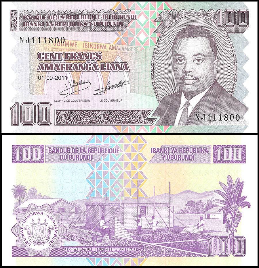 The Burundi 100 Francs banknote is part of the family of notes issued in 2011. The obverse features the Independent Monument in Bujumbura and the former Prime Minister and Crown Prince Louis Rwagasore. The back of the note displays a construction of a cinderblock building, a banana tree, and the nations Coat of Arms. This 125 x 65 mm paper bill has a solid security thread and bears the signatures of Kanyana and Sindayigaya.
