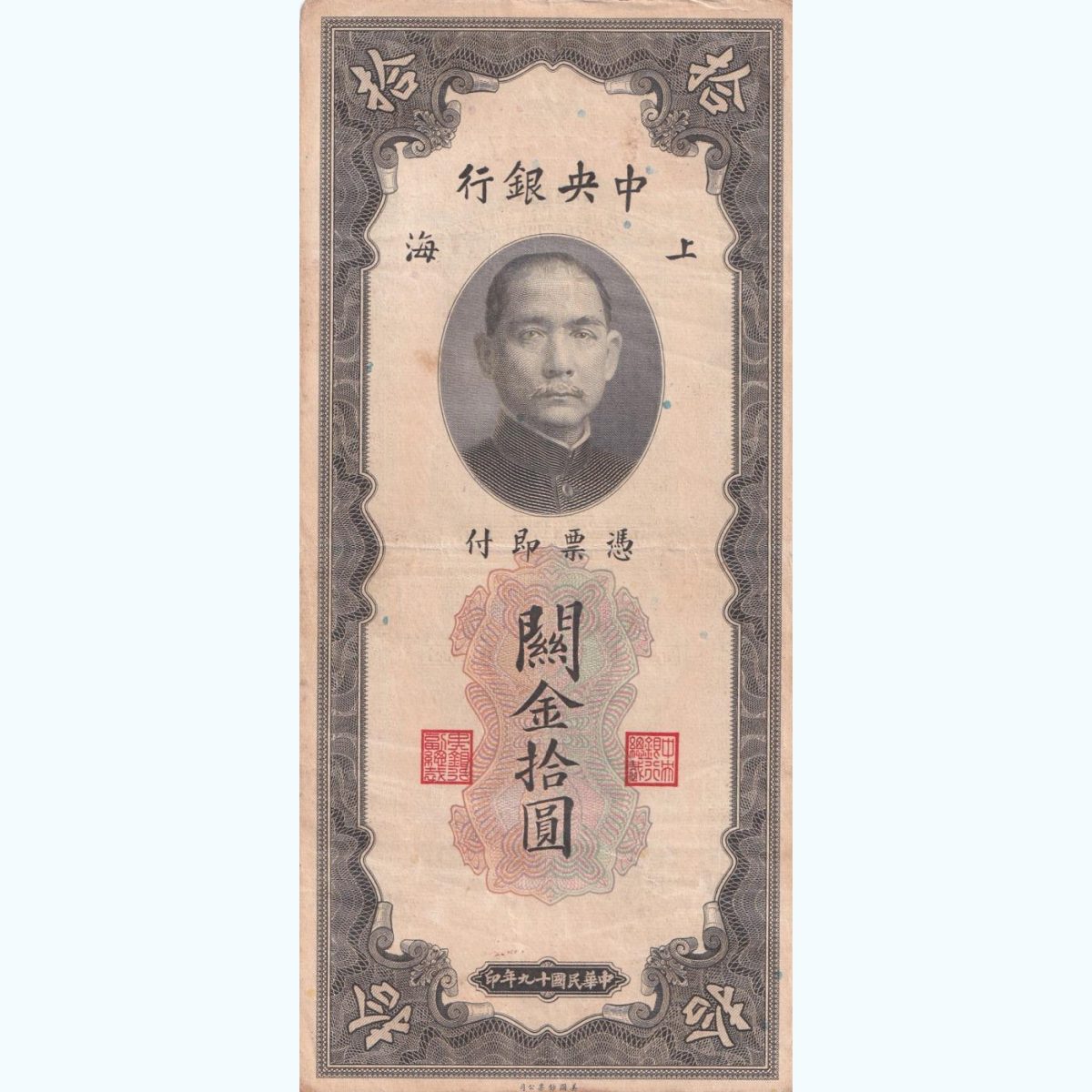 Dive into the fascinating world of numismatics with this exquisite China 10 Ten Customs Gold Units banknote from 1930, issued in Shanghai. Crafted from pure gold, this large-sized rare note boasts historical significance and aesthetic appeal. The intricate design reflects the artistry of the era, featuring intricate patterns and detailed engravings. With its rarity and historical context, this collectible holds a special place in the hearts of enthusiasts and collectors alike.