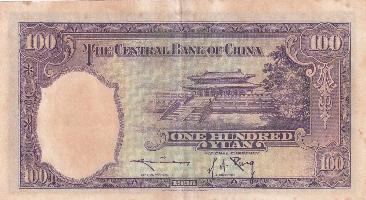 China, 100 Yuan 1936 Central Bank of China RARE BIG SIZE TOP CONDITION NOTE