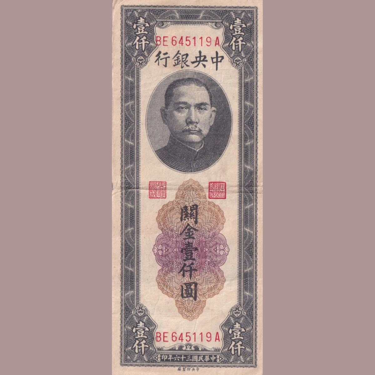 China 1000 One Thousand Customs Gold Units 1947 Very Rare Note