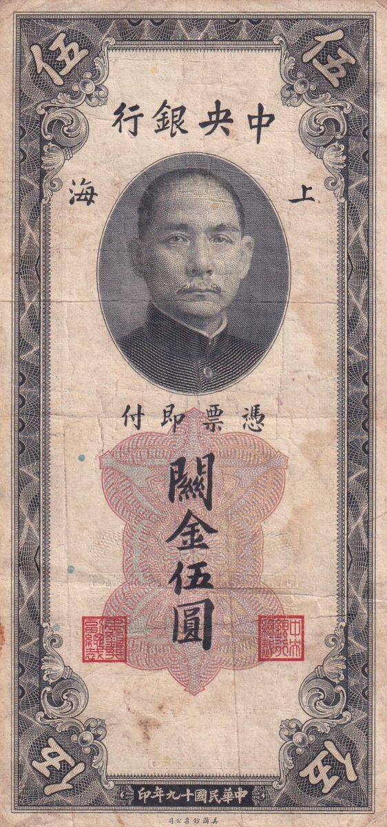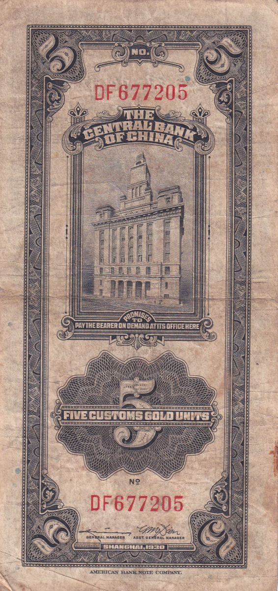 The China, Republic of 5 Customs Gold Units rare banknote from 1930 is a fascinating piece of numismatic history. Issued by the Central Bank of China during the Republic era (1912-1949), this standard banknote features a denomination of 5 Customs Gold Units, reflecting the economic landscape of the time. Measuring 170 × 80 mm and made of paper, this rectangular note bears the Chinese republican calendar date and holds significant value for collectors due to its rarity and historical significance. Despite being demonetized, its allure lies in its intricate design, representing a bygone era of Chinese monetary system. For collectors and enthusiasts, this banknote is not just a piece of currency but a tangible link to a pivotal period in Chinese history, making it a prized addition to any collection.