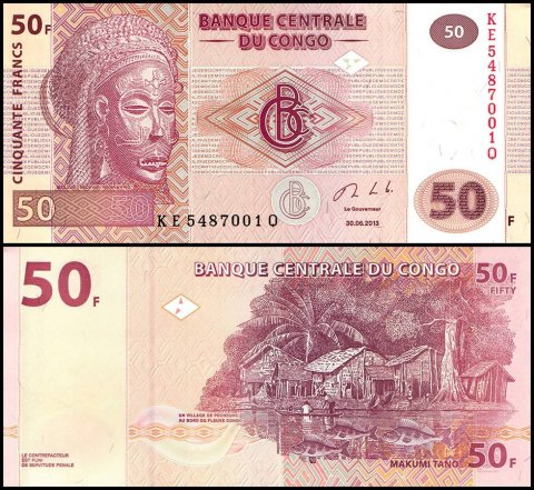 Congo Democratic Republic 50 Francs Banknote from 2020 is in uncirculated (UNC) condition and features a mwana pwo mask.