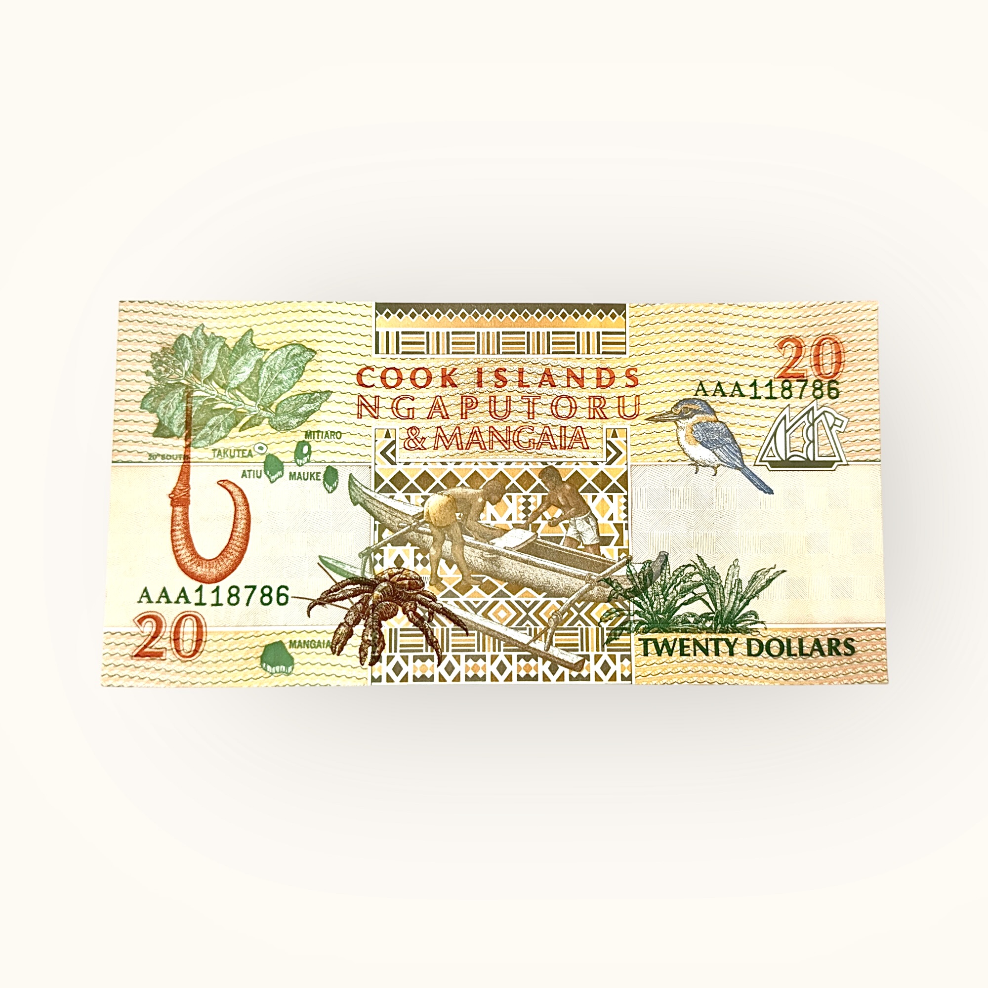 Ngaputoru & Mangaia atolls and outlined maps depicting the islands of Atiu, Mauke, Mitiaro, Takutea, Mangaia, Islanders by a canoe with an outrigger, Camphor tree (Cinnamomum camphor), Carved shark hook from Mangaia made of ironwood root, Mangaia kingfisher (Todiramphus ruficollaris), Coconut crab (Birgus latro), and Rarotonga Meryta – Kakavatua (Meryta pauciflora)