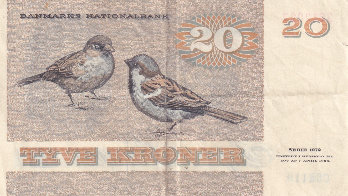 Denmark 20 Kroner “Spurve” Painting and Animal rare lowest price note #b-2