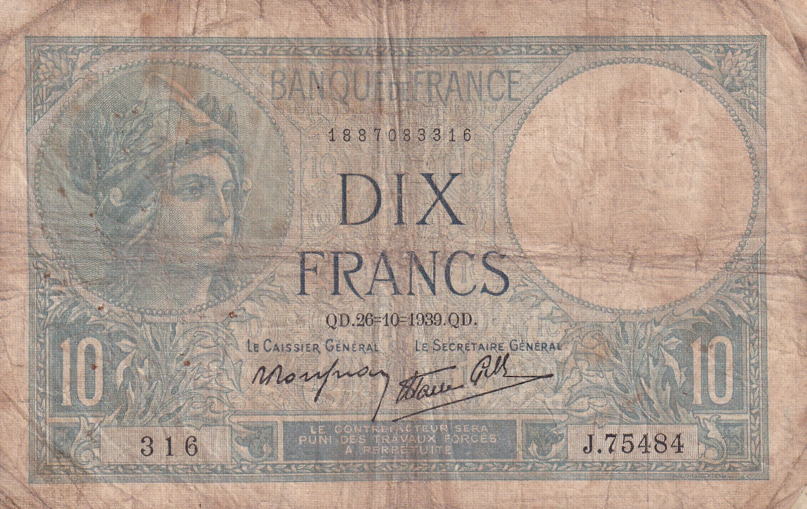 France 10 Francs 1939 Series Rare Note Normally Repaired