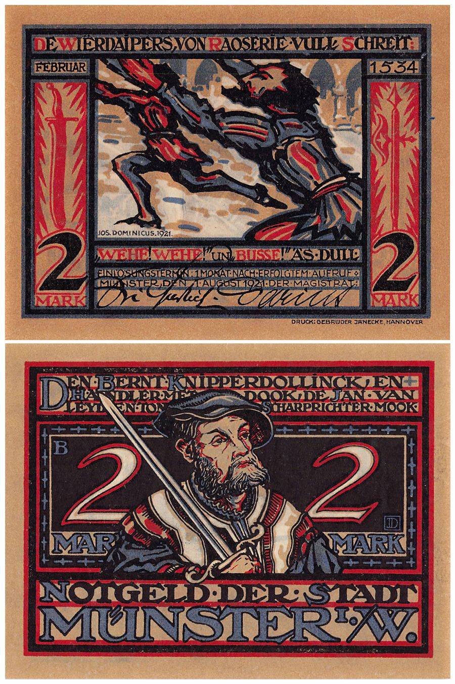 - Historical Theme: This specific 2 Mark series focuses on the violent history of the Anabaptist Rebellion in 1534-1536. The reverse of each note features key figures and events, such as Jan van Leiden (Jan Beukelzoon), Bernt Knipperdollinck, and their eventual execution and hanging in cages from St. Lambert’s Church.