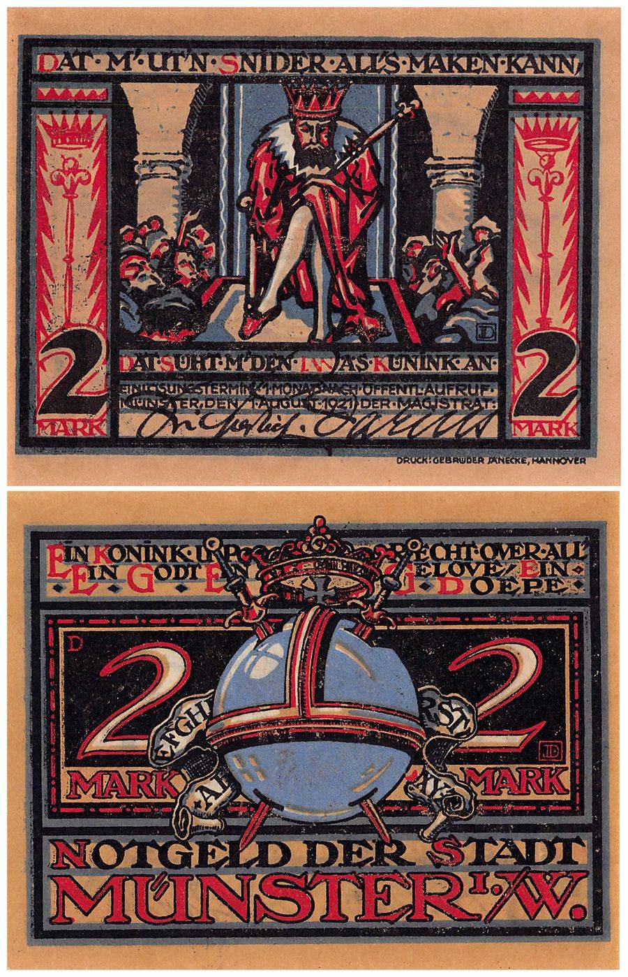 - Historical Theme: This specific 2 Mark series focuses on the violent history of the Anabaptist Rebellion in 1534-1536. The reverse of each note features key figures and events, such as Jan van Leiden (Jan Beukelzoon), Bernt Knipperdollinck, and their eventual execution and hanging in cages from St. Lambert’s Church.