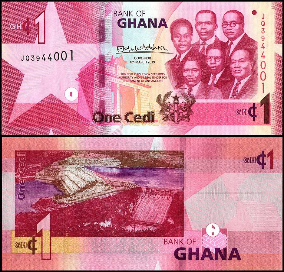 This uncirculated 1 Ghanaian cedi note is a standard circulation banknote issued by the Bank of Ghana. It is a red note that is dated 4th March 2019, bears the signature of Ernest Addison, and measures 137 mm x 65 mm. Its obverse side features the Freedom and Justice arch in Independence Square, a stack of nine gold bars, a star, and portraits of Kwame Nkrumah, Ebenezer Ako Adjei, Edward Akuto-Addo, Joseph Boakye Danquah, Emmanuel Odarkwei Obetsebi-Lamptey, and William Ofori Atta. Its reverse side shows a view of the Akosombo Dam and gold bars. Security features include a RAPID windowed security thread with a demetalized star and 1 and a watermark of Tetteh Quarshie and a cocoa pod with an electrotype 1 and Cornerstones.