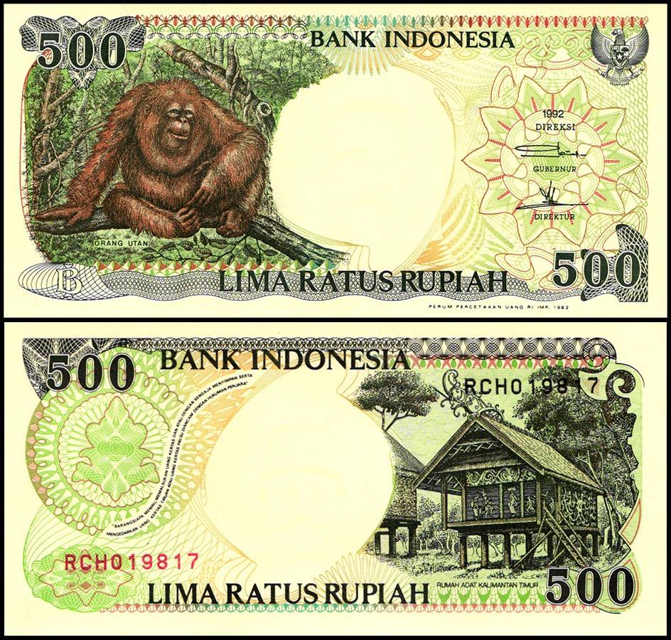 Indonesia 500 Rupiah banknote from 1992 has a pick number P-128a, is in uncirculated (UNC) condition, and features an orangutan.