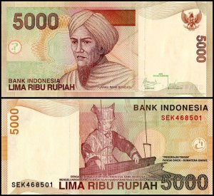 Indonesia 5,000 Rupiah Banknote from 2009 uncirculated (UNC) condition and features Tuanku Imam Bondjol.