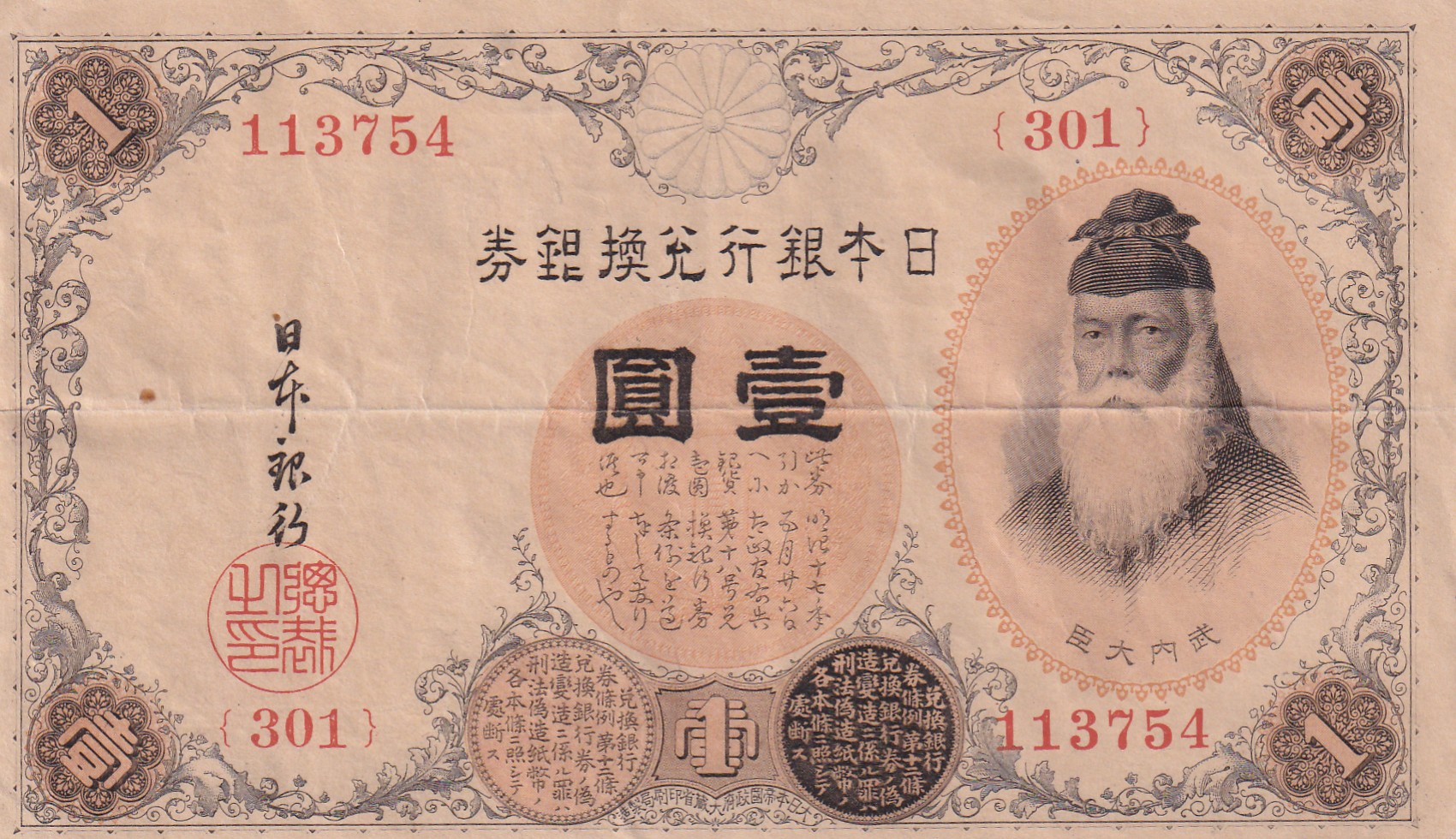 Portrait of Takenouchi no Sukune at right.